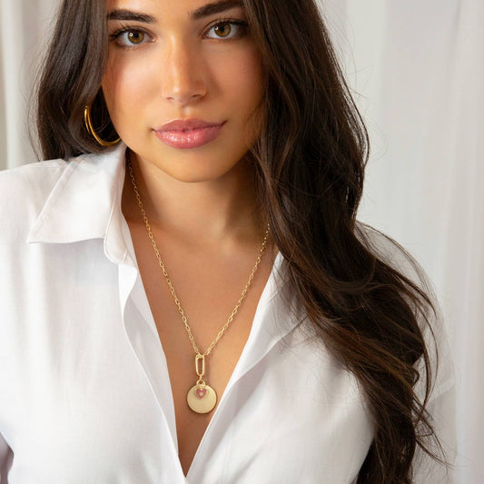 Pink Enamel Heart and Gold Double Disc Pendant Necklace
