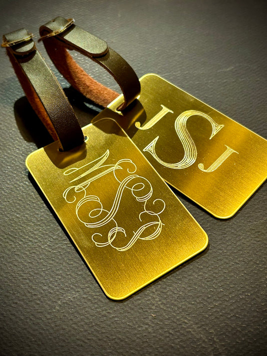 Solid Brass Luggage Tag with Brown Leather Strap