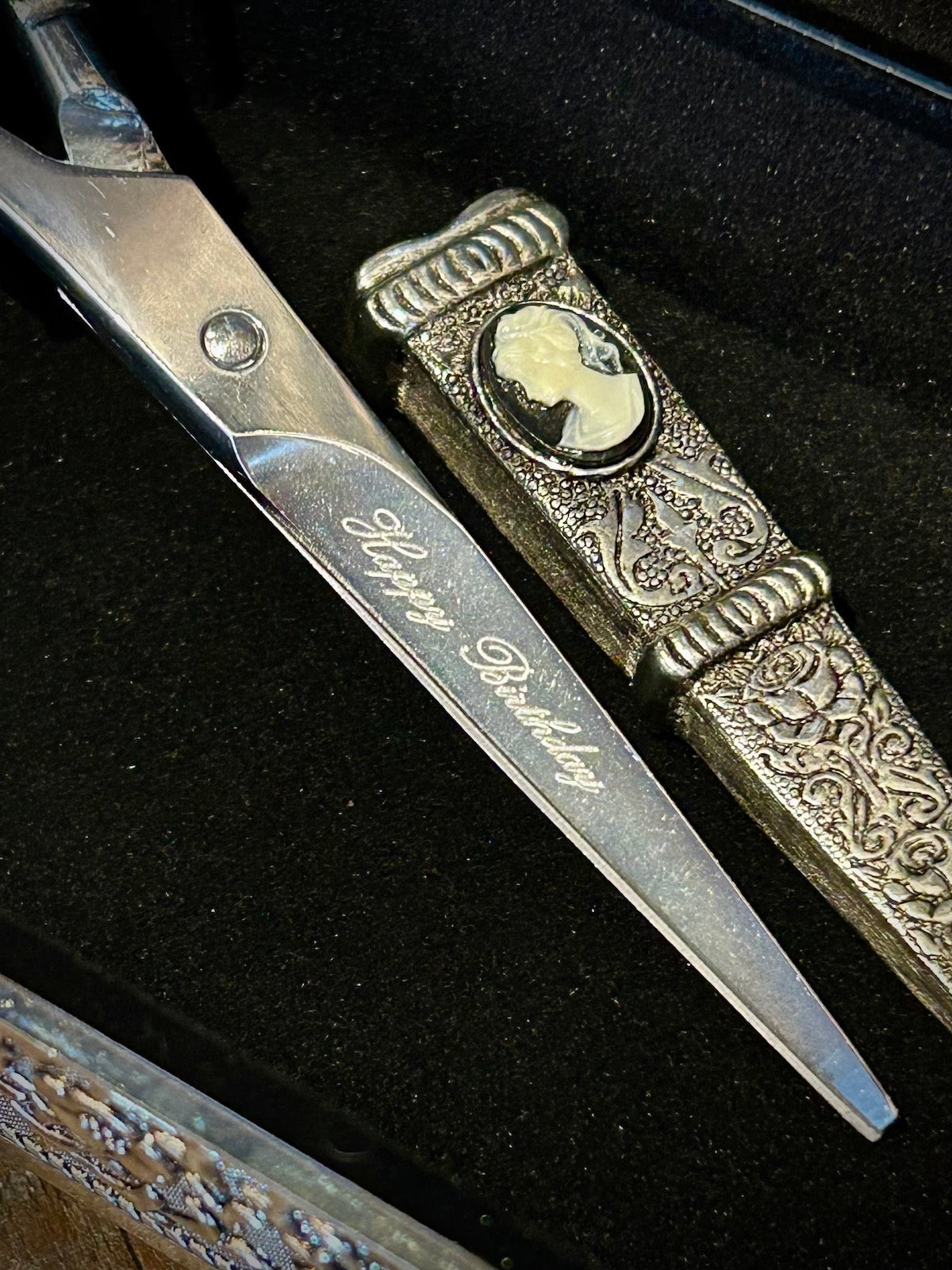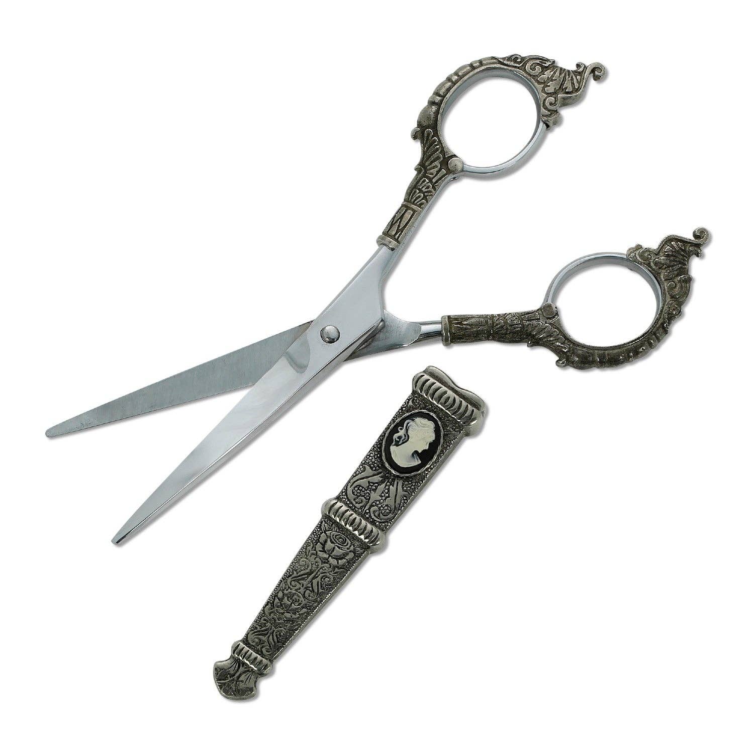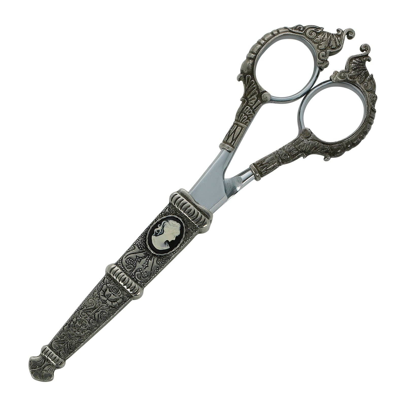 Straight out of the 1928 Jewelry vault, these high-quality antiqued scissors a perfect for any common use! Embellished with vintage-inspired motifs in pewter and a black and white cameo on the holder. They make a special and unique vintage-style gift for a friend or loved one.