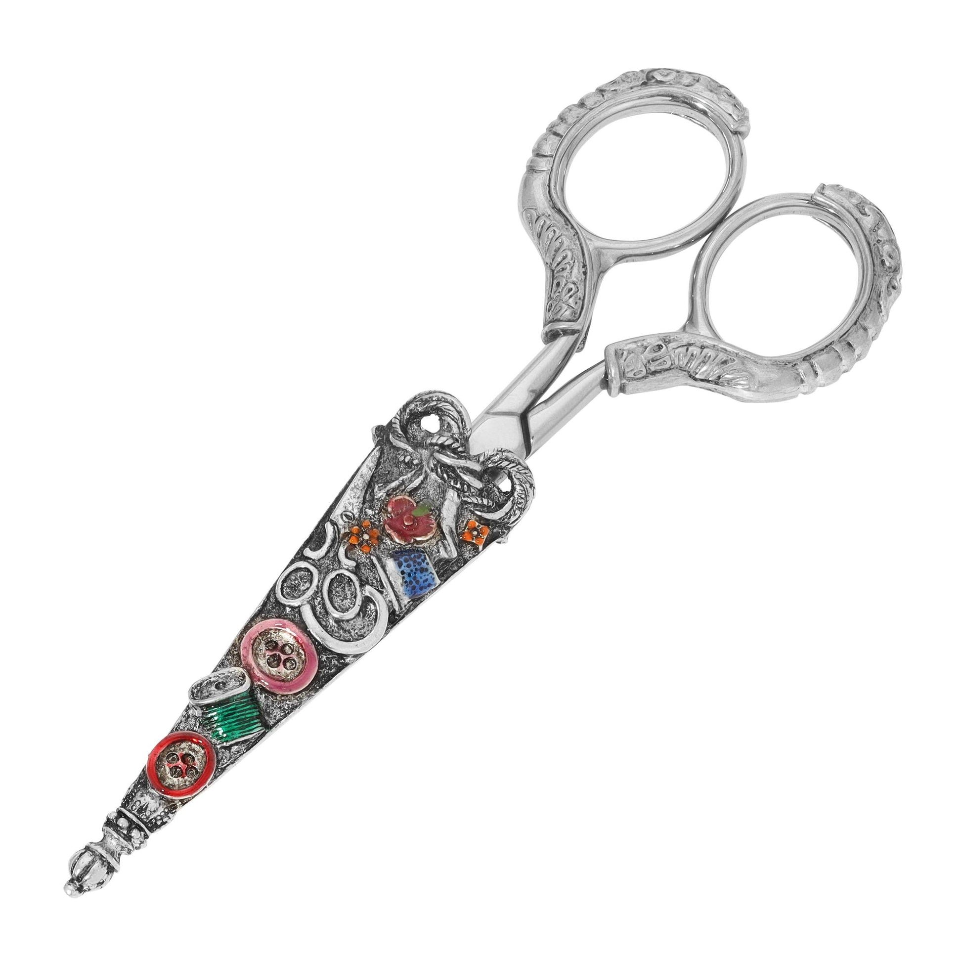 These stainless steel scissors boast intricately designed handles, embellished with ornate detailing reminiscent of vintage sewing tools. Encased in a pewter sheath adorned with delicate buttons, sewing thread motif, and flowers that have been enameled by hand. A testament to the fusion of functionality and creativity, these scissors are the perfect tool for cutting through fabric with both precision and style.