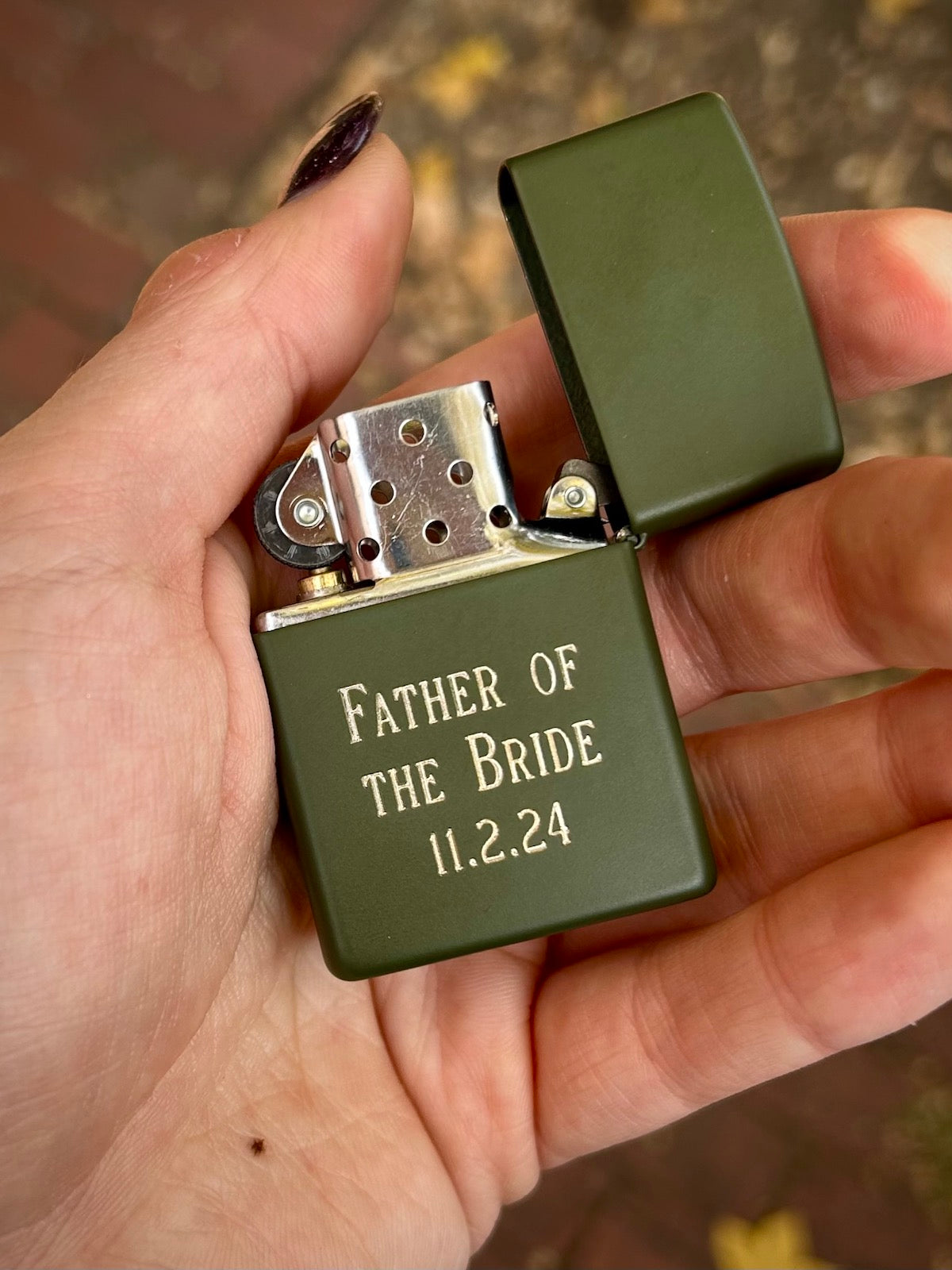 Make this functional tool a cherished keepsake by engraving with a warm message, simply elegant initials, or to commemorate a milestone occasion. Zippo lighters can be engraved on the front & back of the lid and the front & back of the body. Please mention where you would like your engravings placed in the "Note to Engraver" box below.