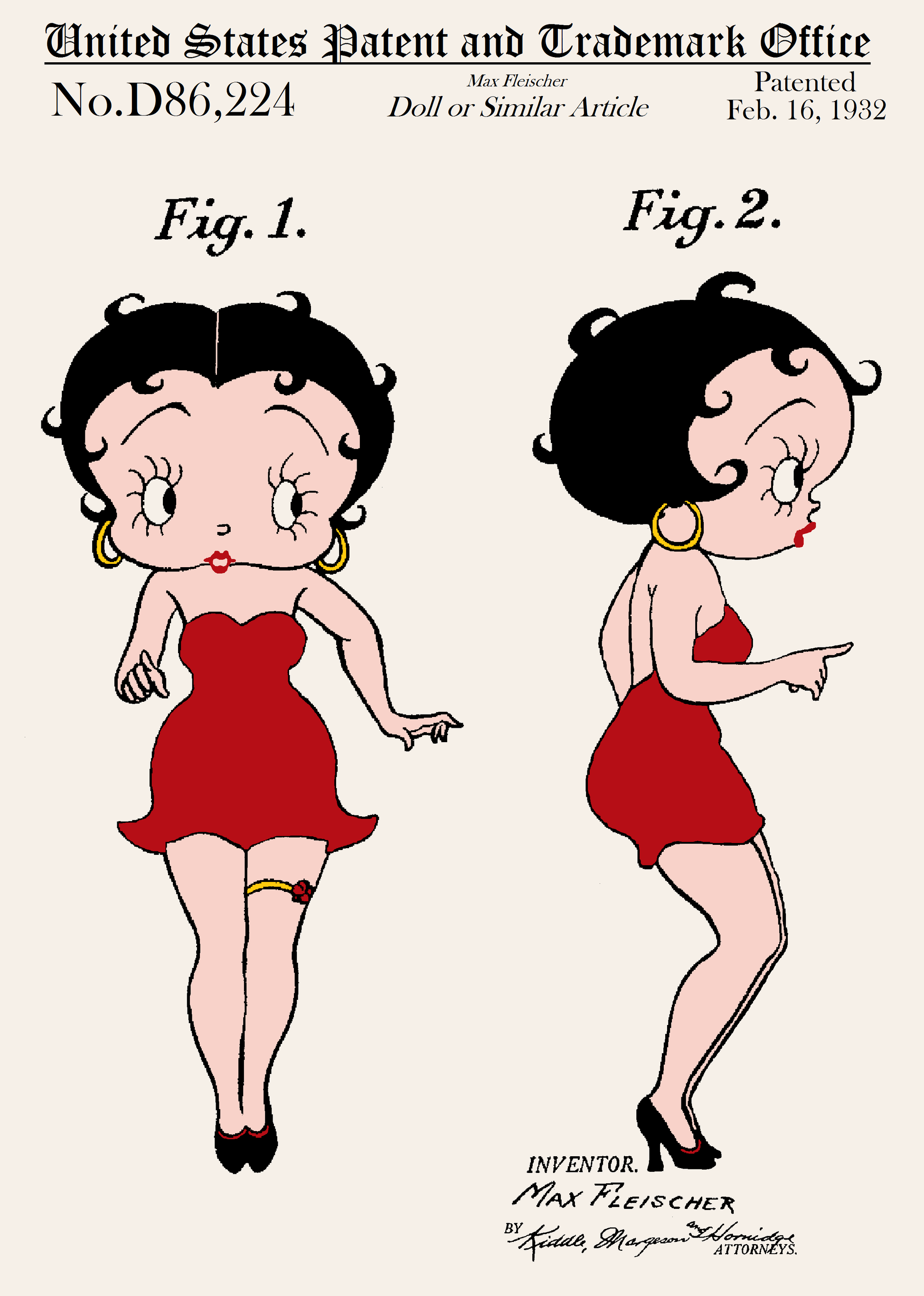 A colored greeting card with the image of a genuine patent for a Betty Boop doll or similar article on the front. The inside is blank so that you can provide your own greeting.