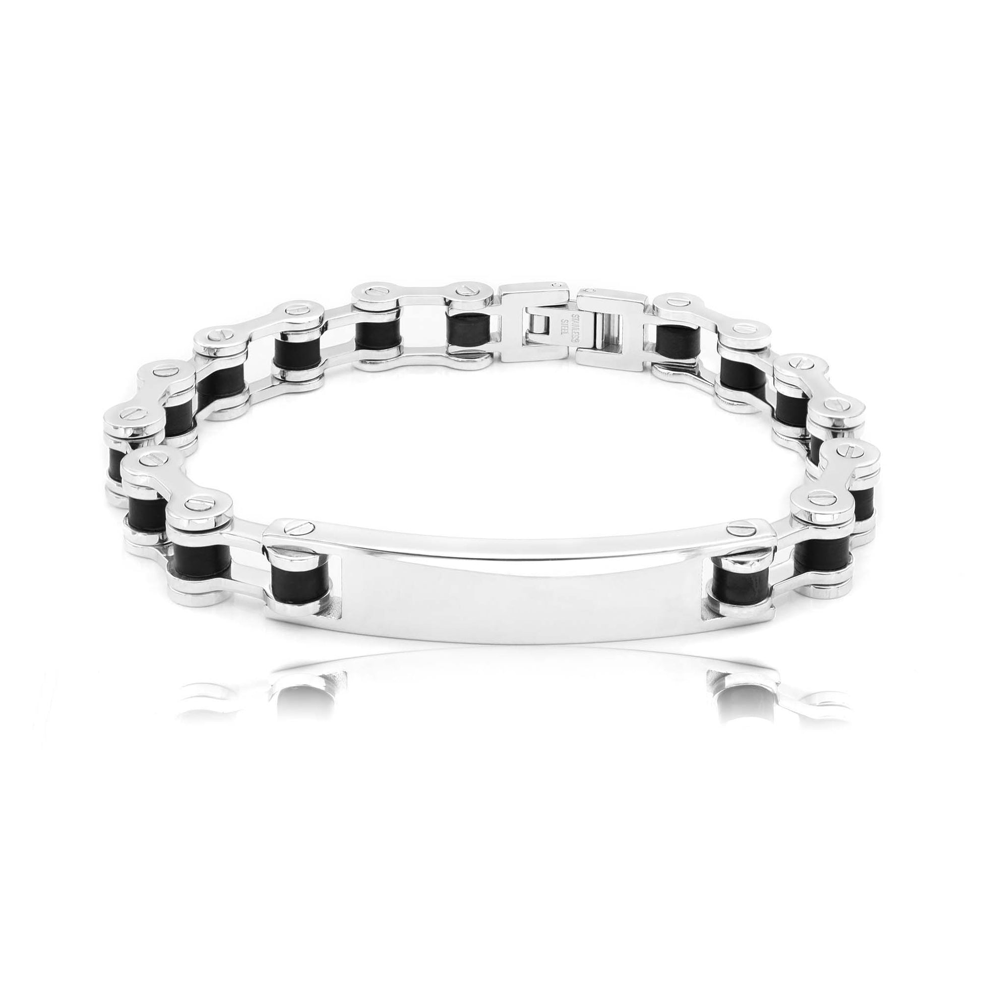 Elevate his style with this unique and trendy stainless steel and leather bike chain ID bracelet for men. The perfect combination of rugged and refined, this bracelet features durable stainless steel links and genuine leather accents. Engrave a special message, date, or initials to create a personalized gift he'll cherish for years to come.