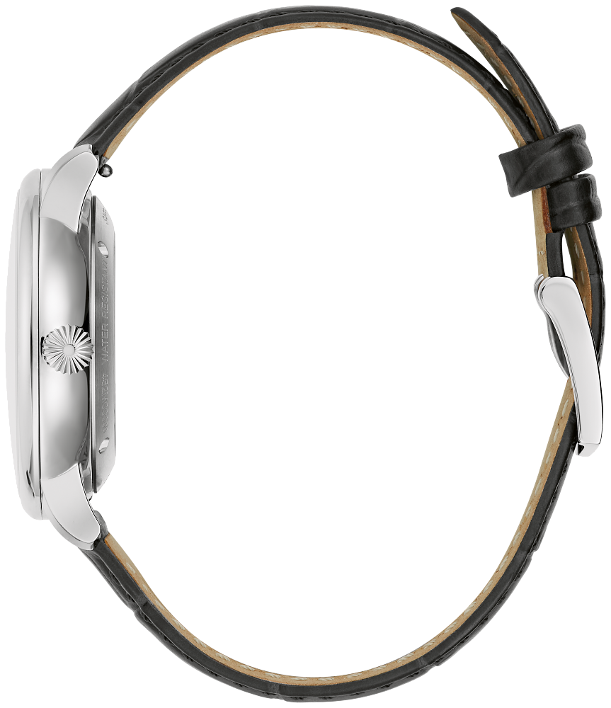 The new elevated classic Bulova Hudson is destined to become your new favorite dress watch. With an entirely new case design and an intricately detailed dial, this watch explores new realms of elegance and offers an exquisite presence. The silver-tone stainless steel 39mm case is sculpted with a convex design and soft contours that wear perfectly on any wrist and is finished with a double-domed sapphire crystal, an elegant onion-shaped crown, and gently curved lugs. The dial is an exercise in balance, texture, and style, with four striking textural finishes culminating an appealing basketweave pattern at the center. Dramatic, arced Roman numerals mark out 6 and 12 o’clock, complemented by polished baton markers and a 3 o’clock date display. The polished silver-tone hands complete the look of simple refinement. Inside the watch ticks an automatic movement, with 21 jewels and a power reserve of 42 hours. The timepiece is naturally paired with a black leather strap fitted with quick-release spring bars for easy changes and a 3-piece closure for ideal comfort. When you need the very best, look no further than the men’s Bulova Hudson.