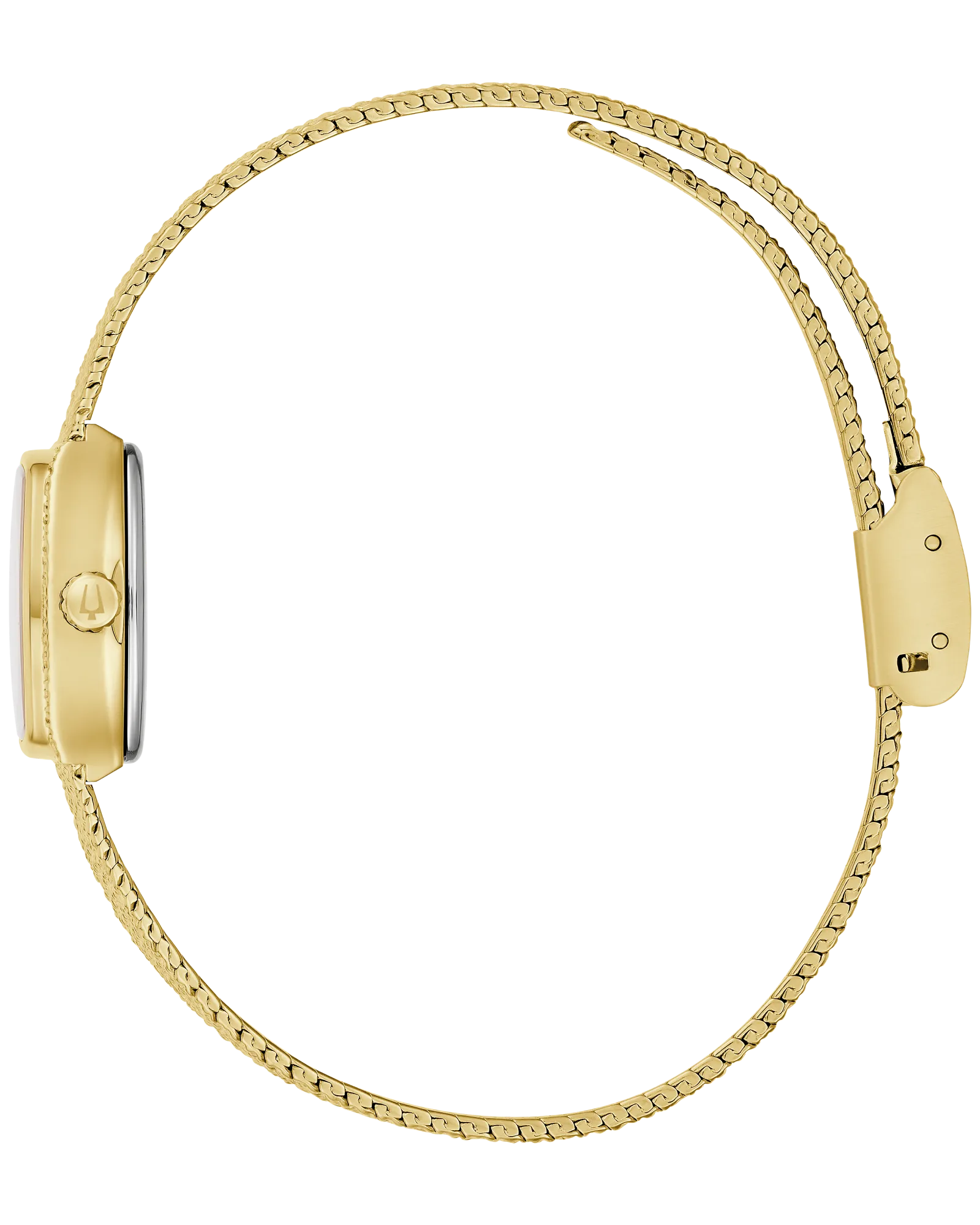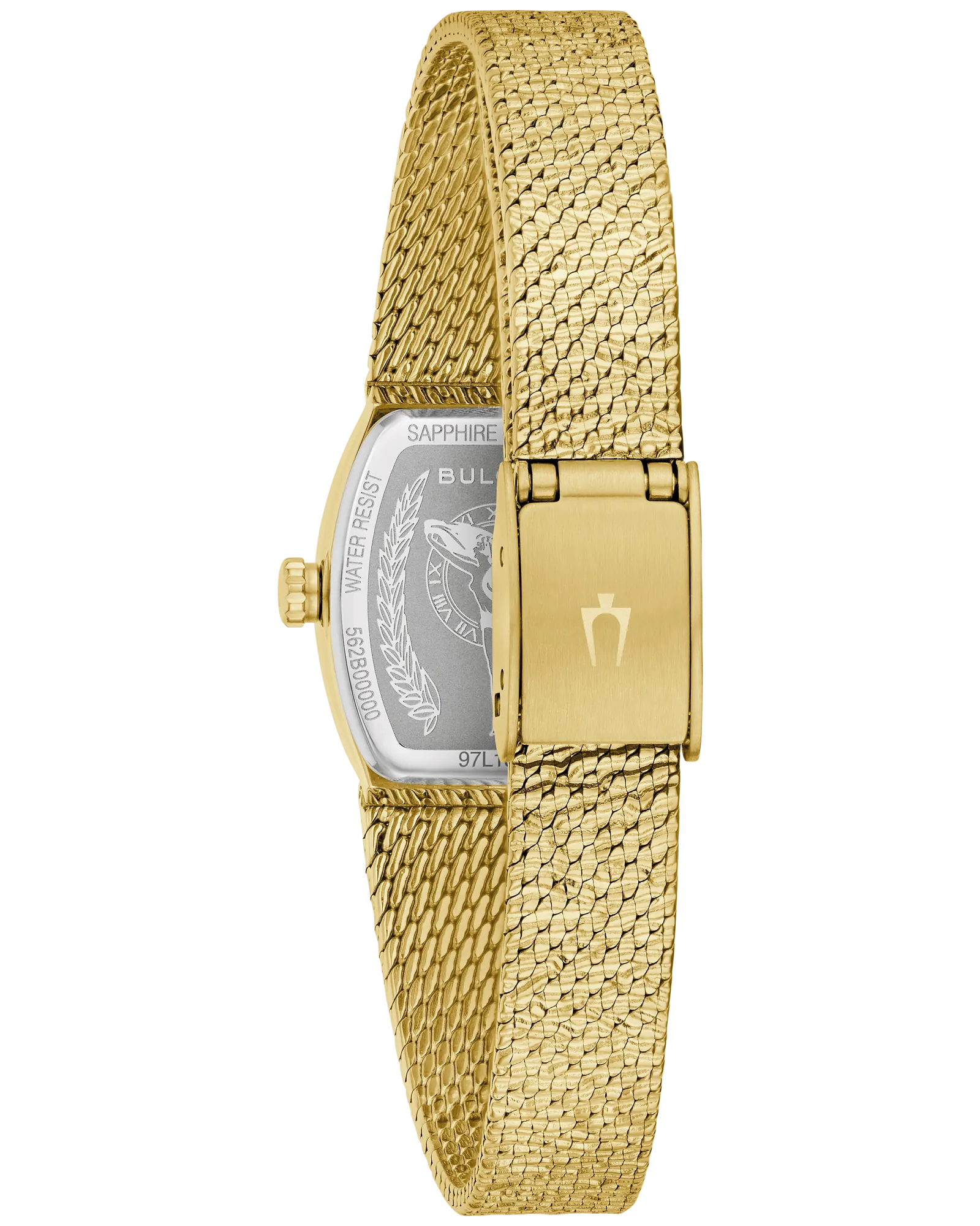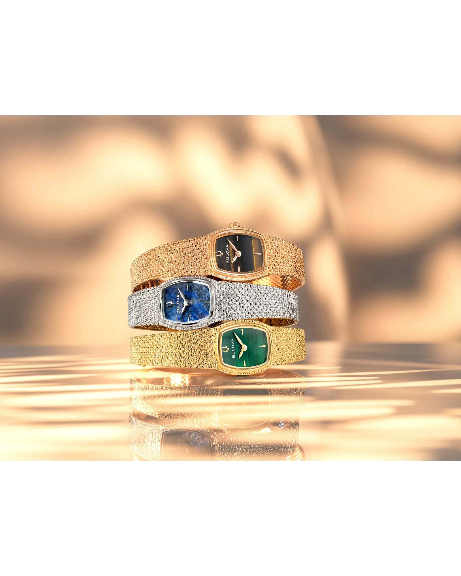 Step back in time to the glitz and glam of the 1970s with the Bulova women’s Classic “Goddess of Time” watch. Borrowing the timeless design of vintage Bulova “Goddess of Time” watches, the gold-tone stainless steel tonneau case has a textured top and a brightly polished bezel, seamlessly transitioning to a textured mesh bracelet with a sliding clasp closure that adjusts from 6″ to 7 ¾″. Each striated genuine green malachite dial is completely unique and is appointed with gold-tone applied markers and matching hands, while Bulova’s Goddess of Time herself is etched onto the case back in intricate definition. Feel truly divine in this stunning Bulova ladies’ timepiece.