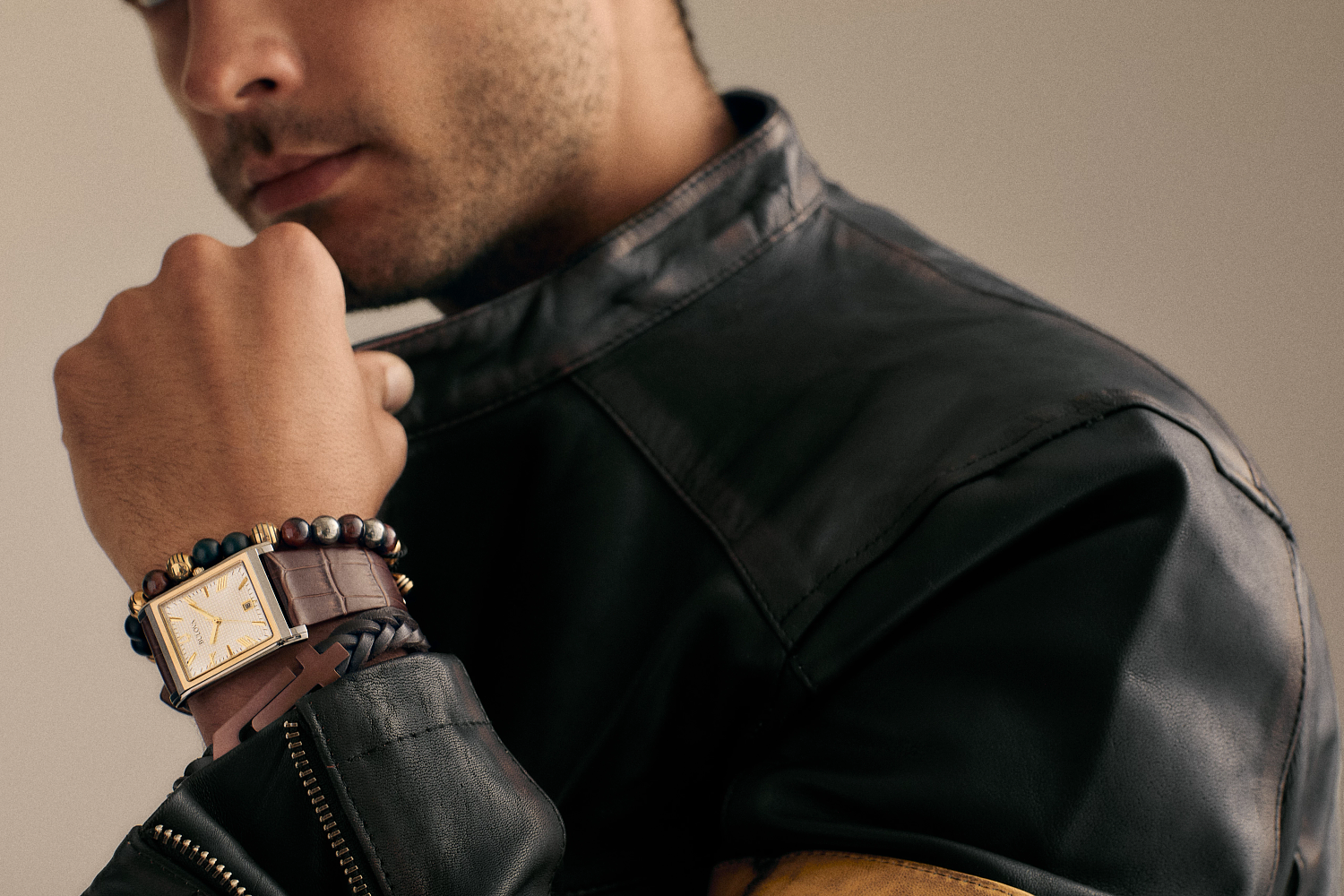 The rectangular men’s Sutton is the new paragon for classic elegance. Crafted with a sleek geometric design with brushed and polished finishing, the slim silver-tone stainless steel case is set with a sapphire crystal and features thoughtfully incorporated angles and lines for an impactful presence on the wrist, with a striking gold-tone bezel providing sophisticated contrast. The textured silver-white dial’s hobnail pattern provides an iconic look, while the alternating gold-tone baton and Roman numeral markers convey a timeless quality. The dial is further appointed with a 6 o’clock date display and polished gold-tone hands. The watch is carefully paired with a brown leather strap fitted with a pin buckle closure. Elevate your style with the slim and stylish rectangular Bulova Sutton.