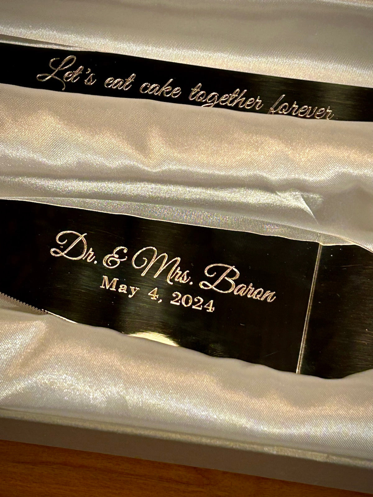 Serrated edge knife is 12.75" long and the serrated edge cake server is 11" long. Sold as a pair. Non-tarnish nickelplate. Comes packaged in a keepsake silver gift box with a white satin liner.