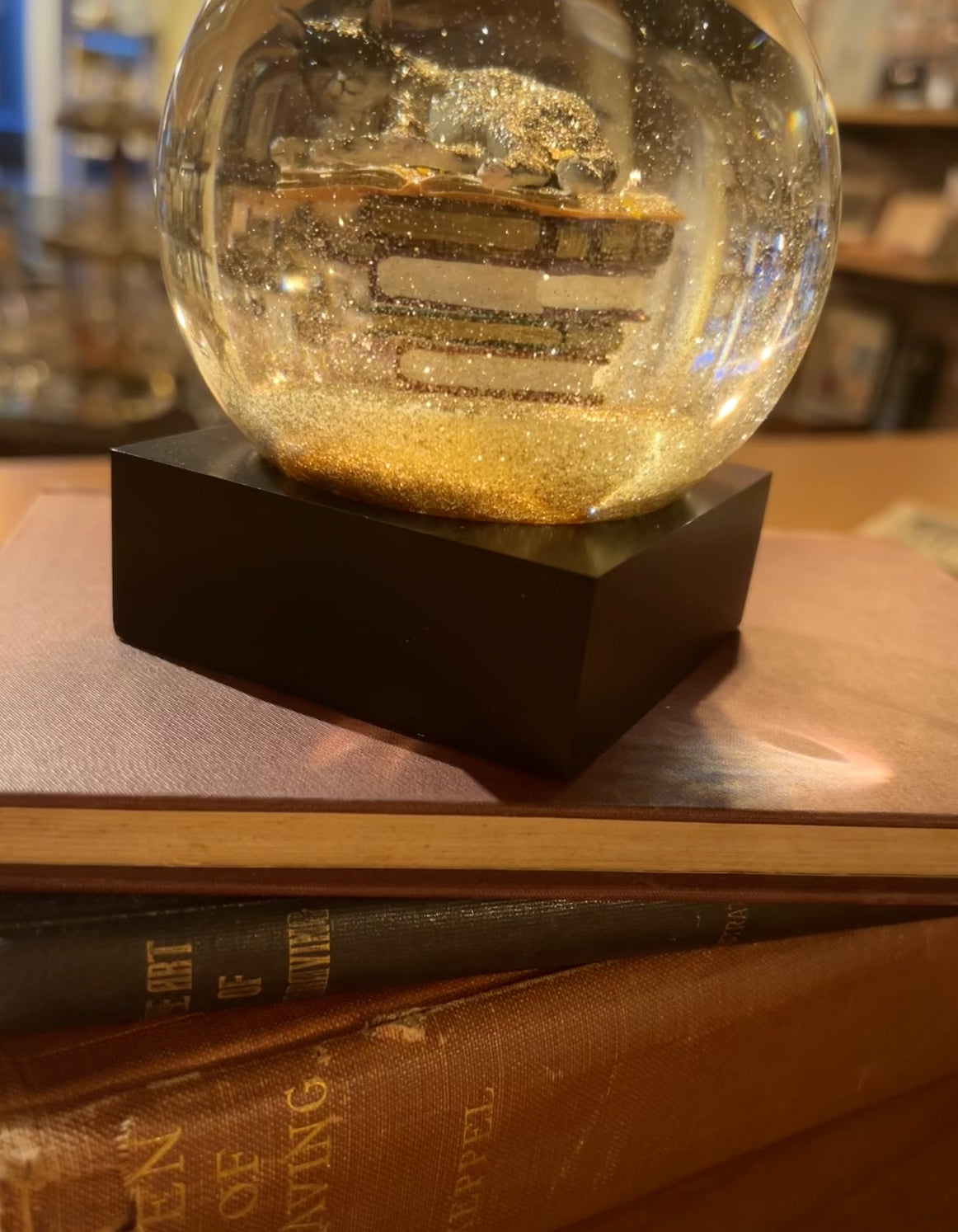 This handcrafted snow globe evokes the aroma and charm of your favorite local used bookstore, where timeless novels and poured-over texts abound in ubiquitous stacks, as a nonchalant cat completes the scene resting in his makeshift abode. This globe is a sure to be loved gift for feline fanatics and avid book worms, especially when the piano black base is engraved with a personal writing deserving of the classics above.