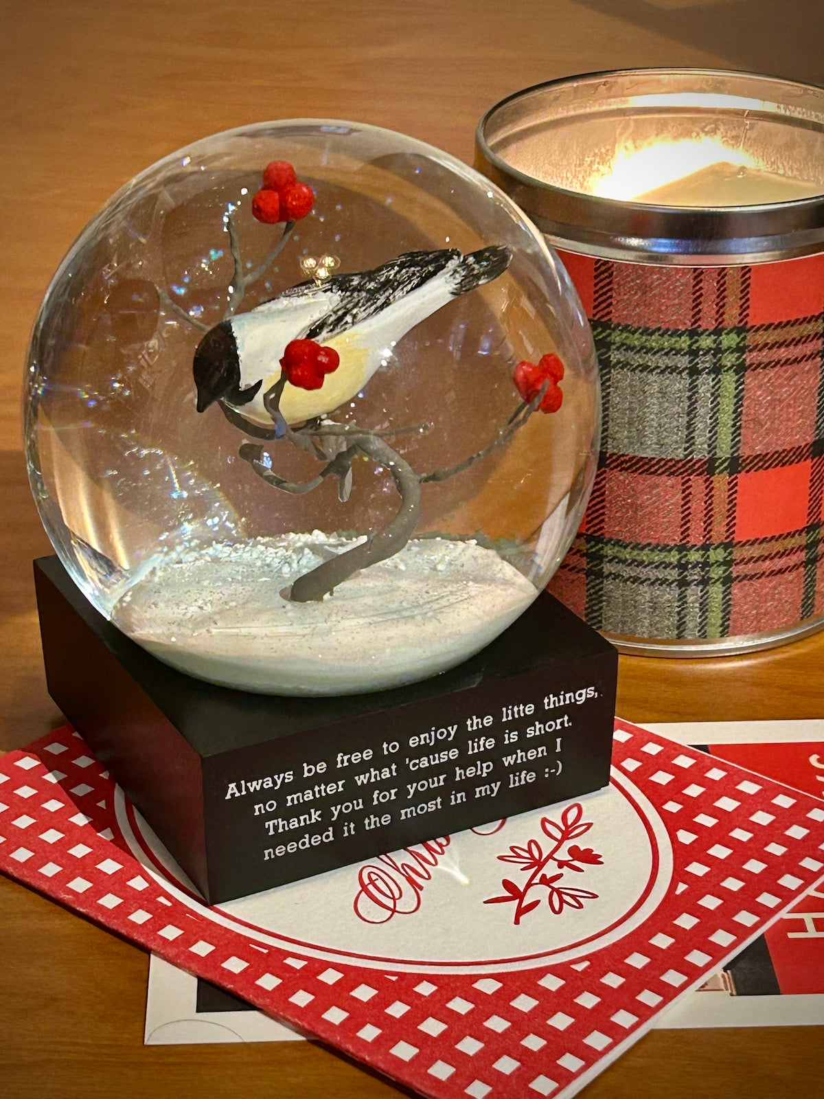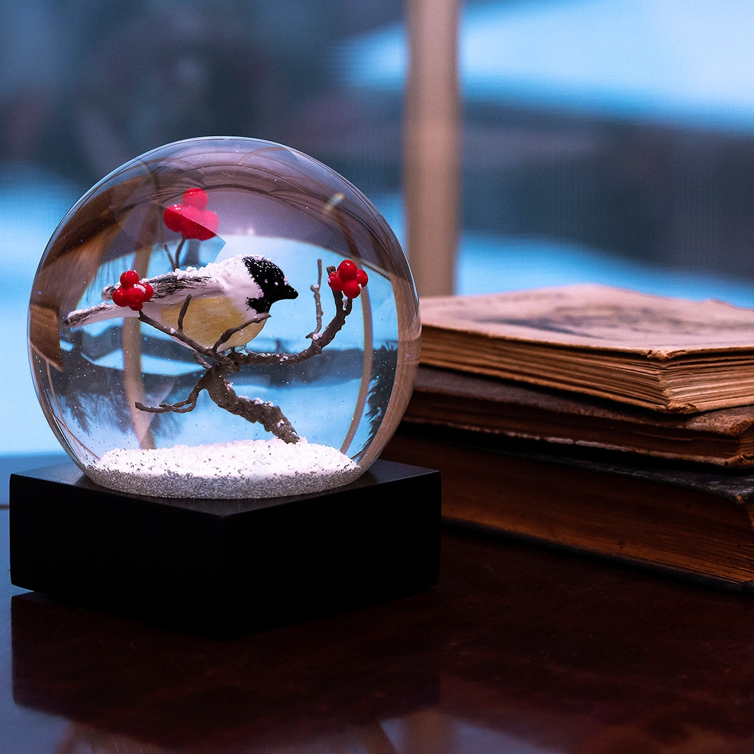 A thoughtful gift for your "little chickadee," an ornithology hobbyist, or anyone who enjoys a cheerful winter scene. Engrave the base with a personalized message to make it a truly memorable gift.
