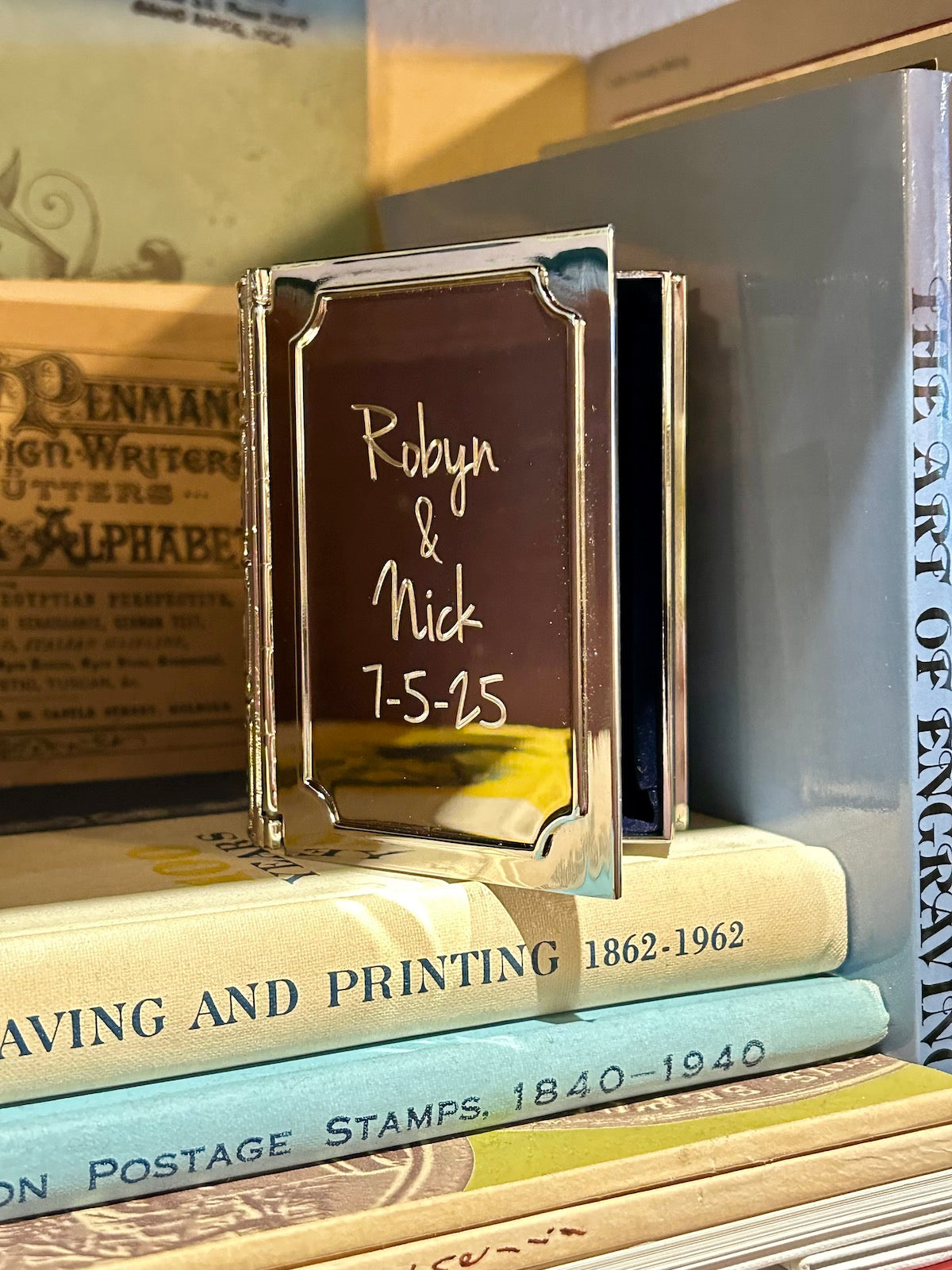 This classic book shaped trinket box is brimming with possible gift themes: our love story, scripture/Biblical, fairy tale, "blank's travels", or as a cute gift for bookworms and librarians.