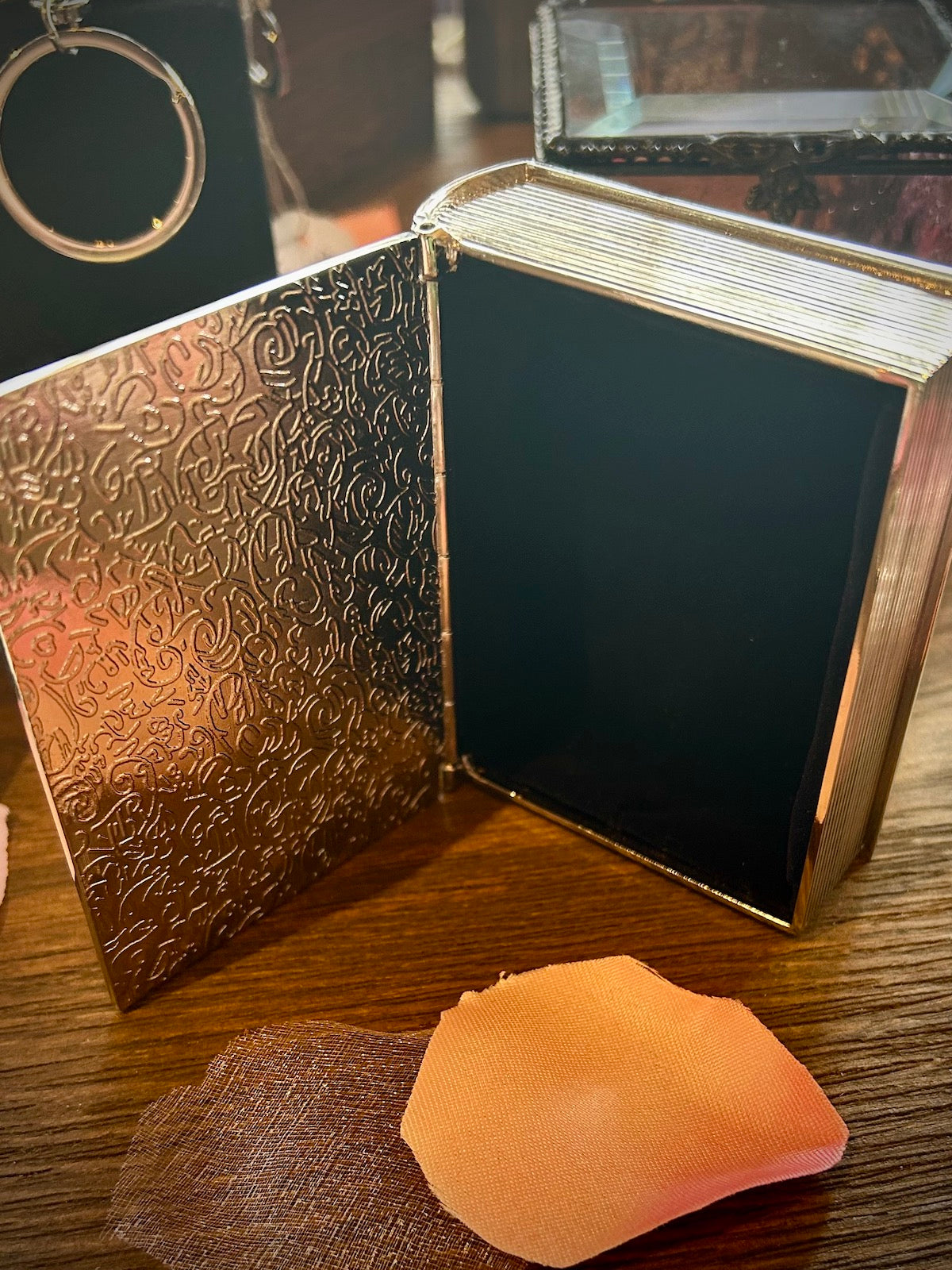 This book is actually a precious little keepsake box, perfect for storing jewelry, valuables, trinkets & more. Three sides feature faux page edges and the fourth side is a faux book spine with Old World design embossings to complete the look of the "book". The lid or book "cover" is hinged and opens to reveal the lined compartment inside.