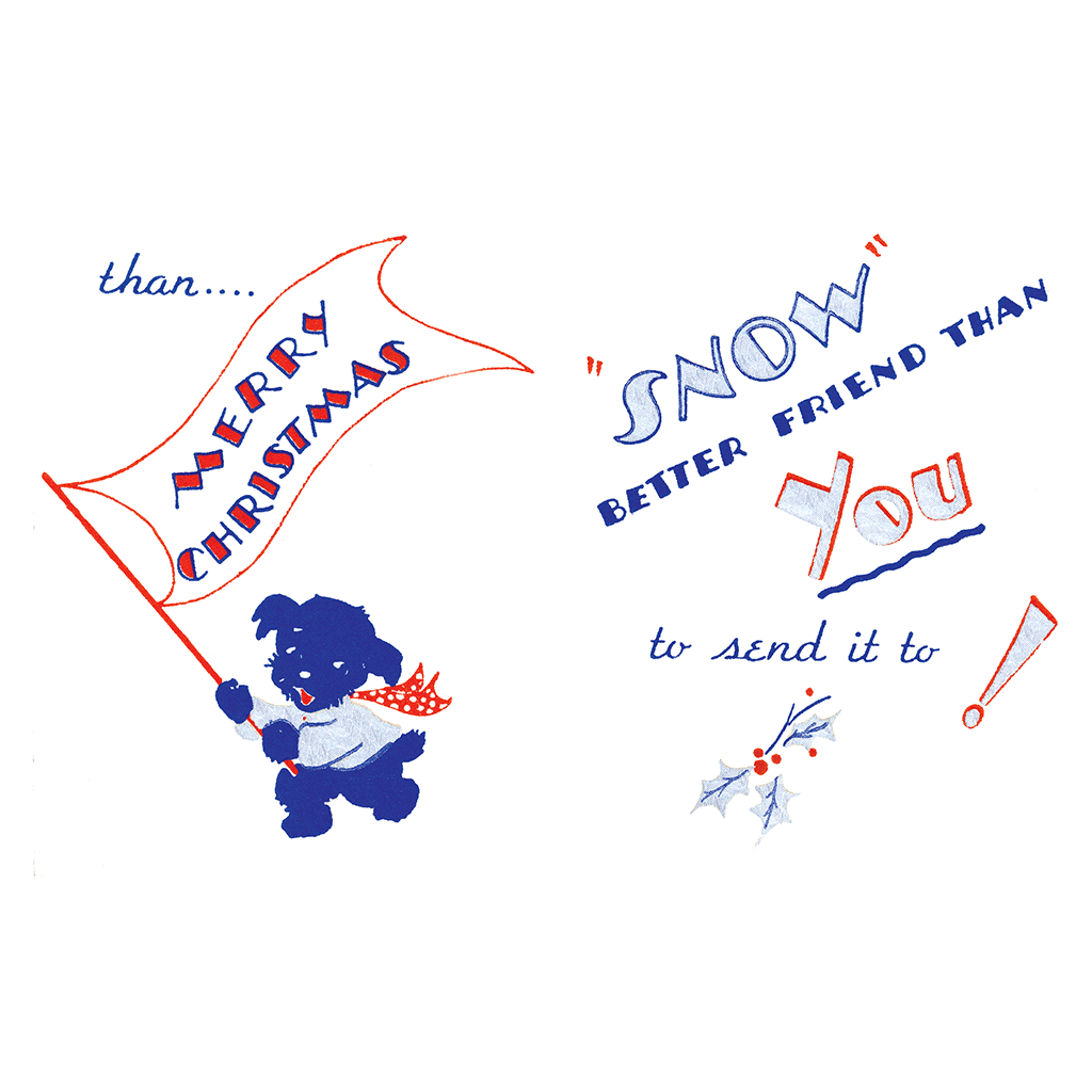 This joyful, snow-loving dog is here to spread Christmas cheer to your friends! This heartwarming image is a mid-century reproduction, brimming with that nostalgic charm of yesteryears. Inside, you'll find an original, funny, punny caption that was typical of the era, sure to bring a smile to anyone's face. It features a stylish interior design with a festive red envelope to make it even more special! This product was custom designed and created at in Seattle.
