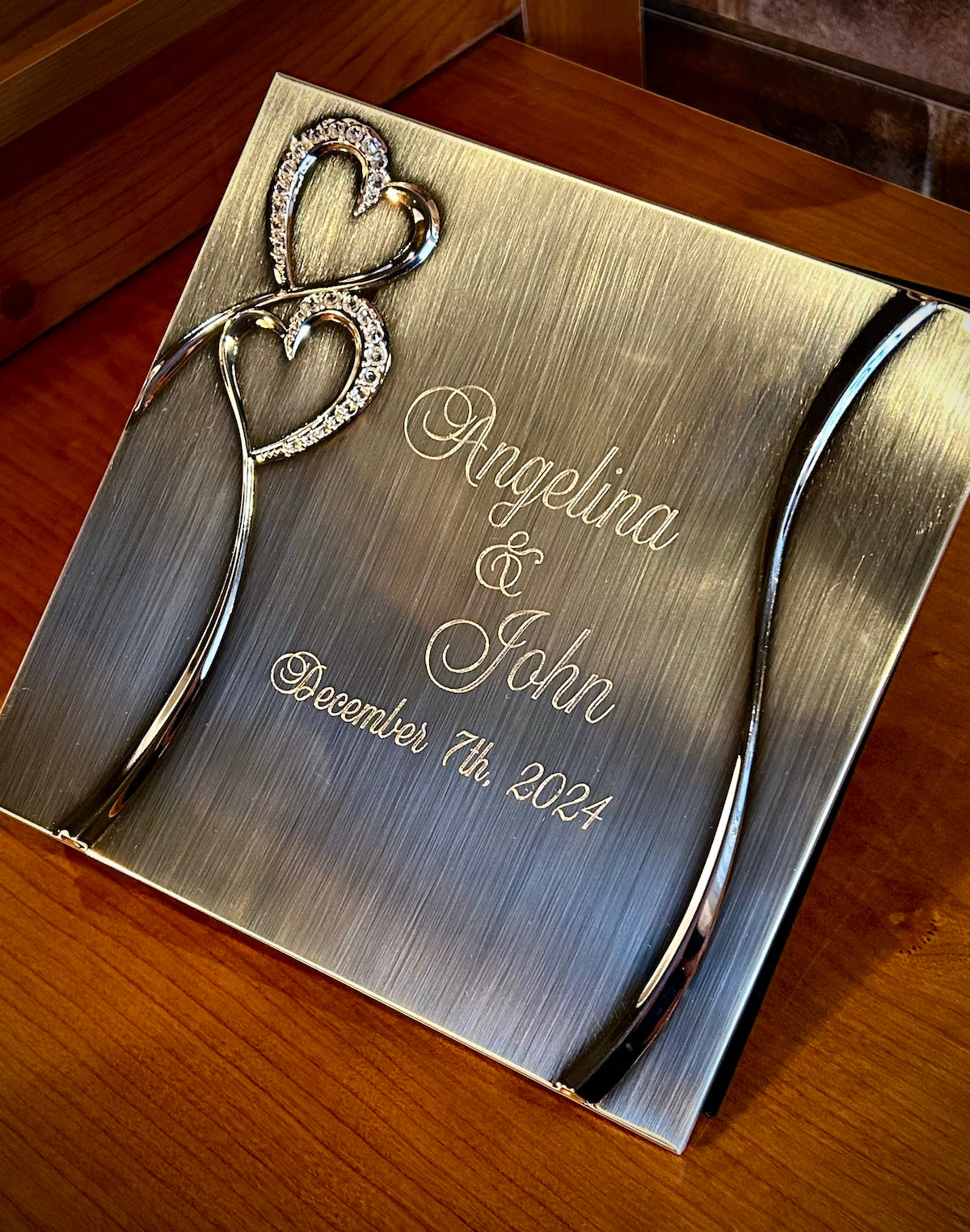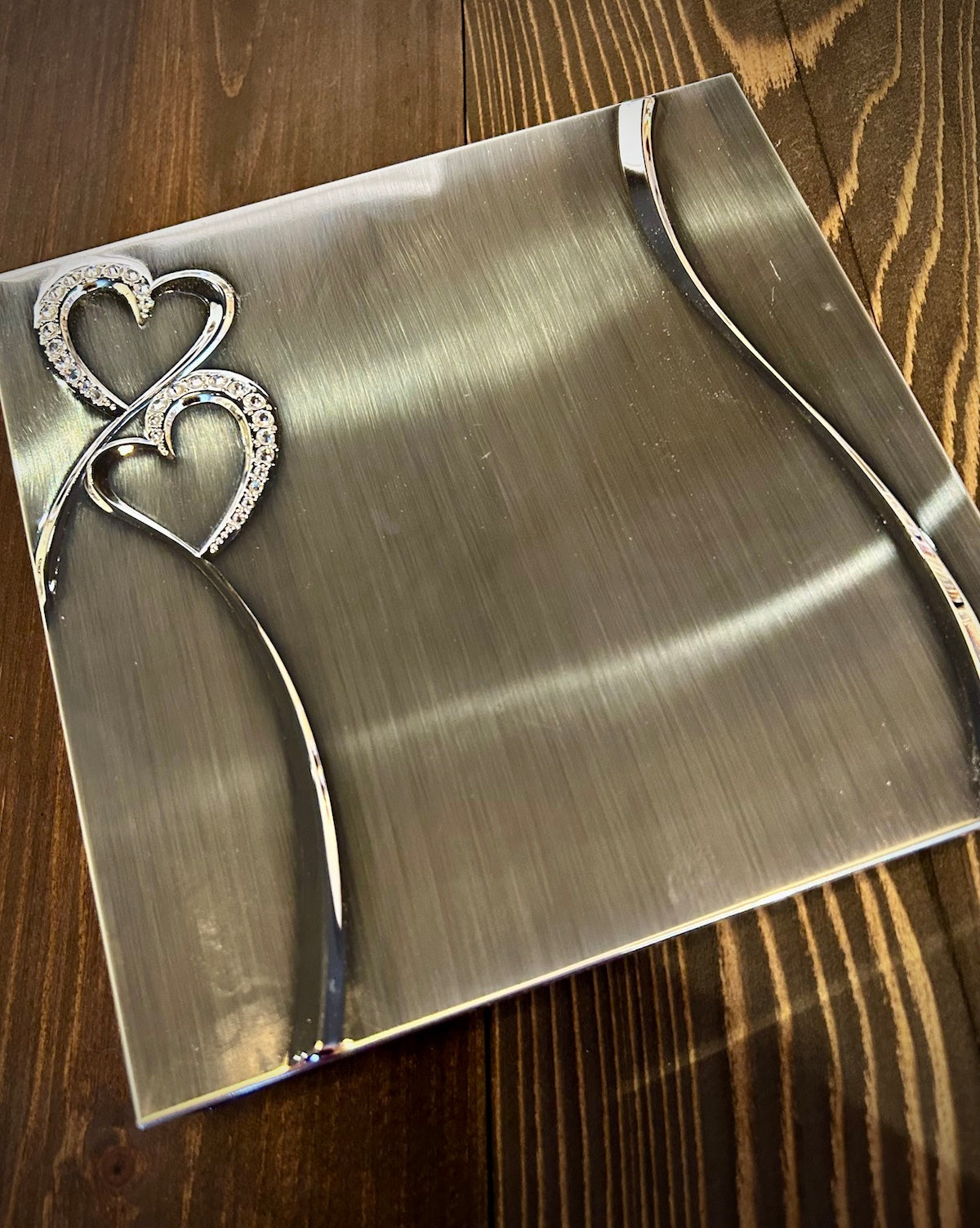 This perfect guestbook features two dazzling intertwined hearts and ample space for engraving names, the date, venue, a passage and more on the brushed silver cover. The inside is filled with lined pages for guests to sign and leave a message.