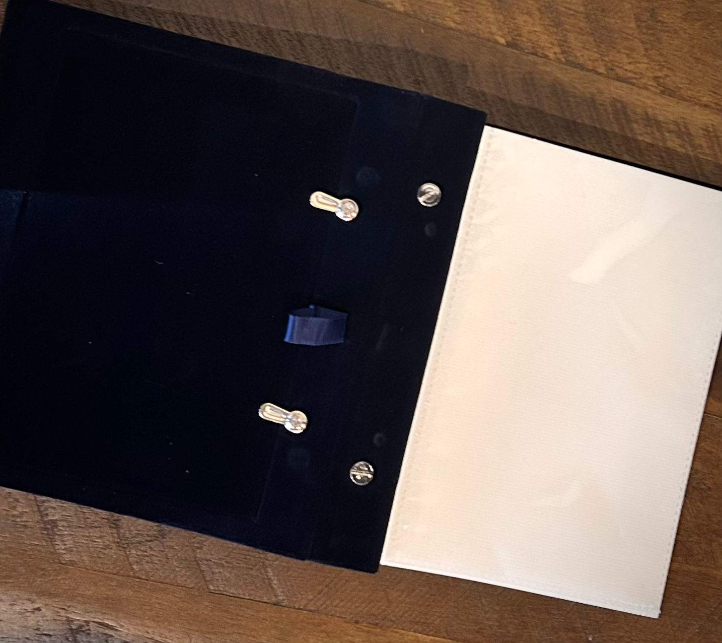 This album has a photo frame cover that holds a 4" x 6" photo. This is a great way to display your favorite photo and a great album to keep your treasured memories. The inside cover has a dark blue flocking and a hinged door that opens allowing easy access to the photo so you can change the photo with ease. Perfect for family vacations, weddings, new babies, graduations, and any other special occasion.