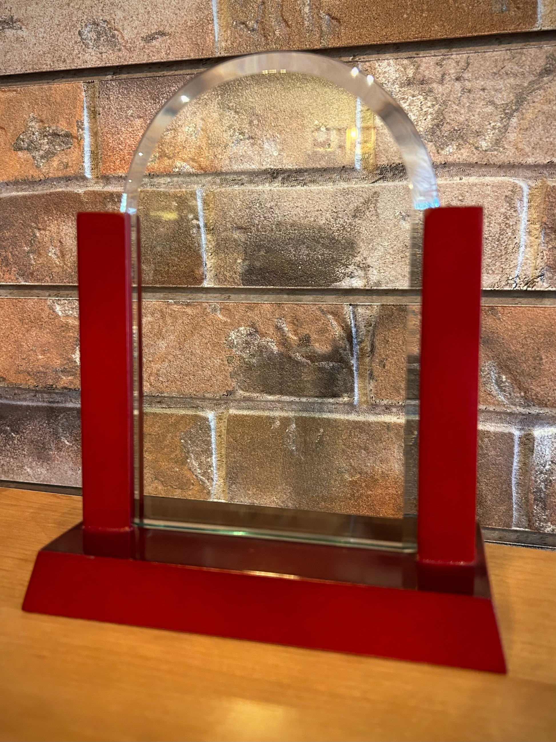 Recognize your team, whether that be in business, athletics or otherwise, with a professionally engraved award. This one features an elegantly shaped "gateway" faceted jade glass and rosewood finish base, perfect for whoever is your gateway to success.