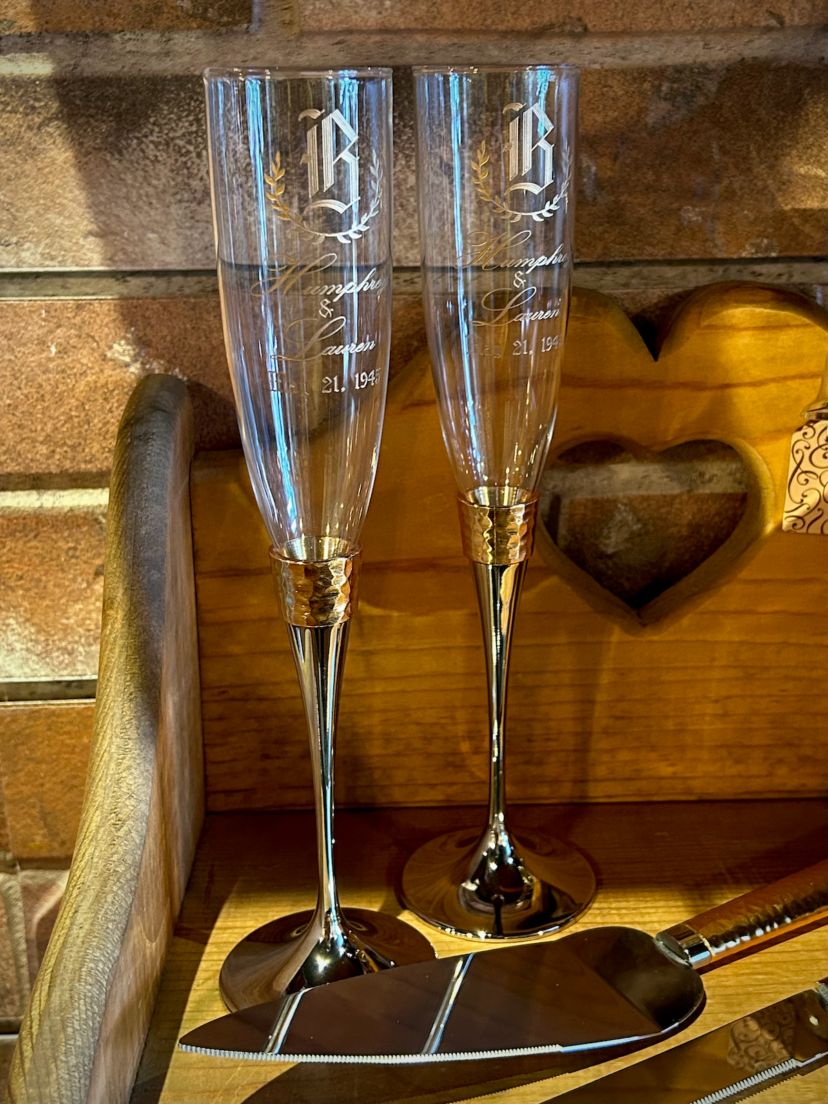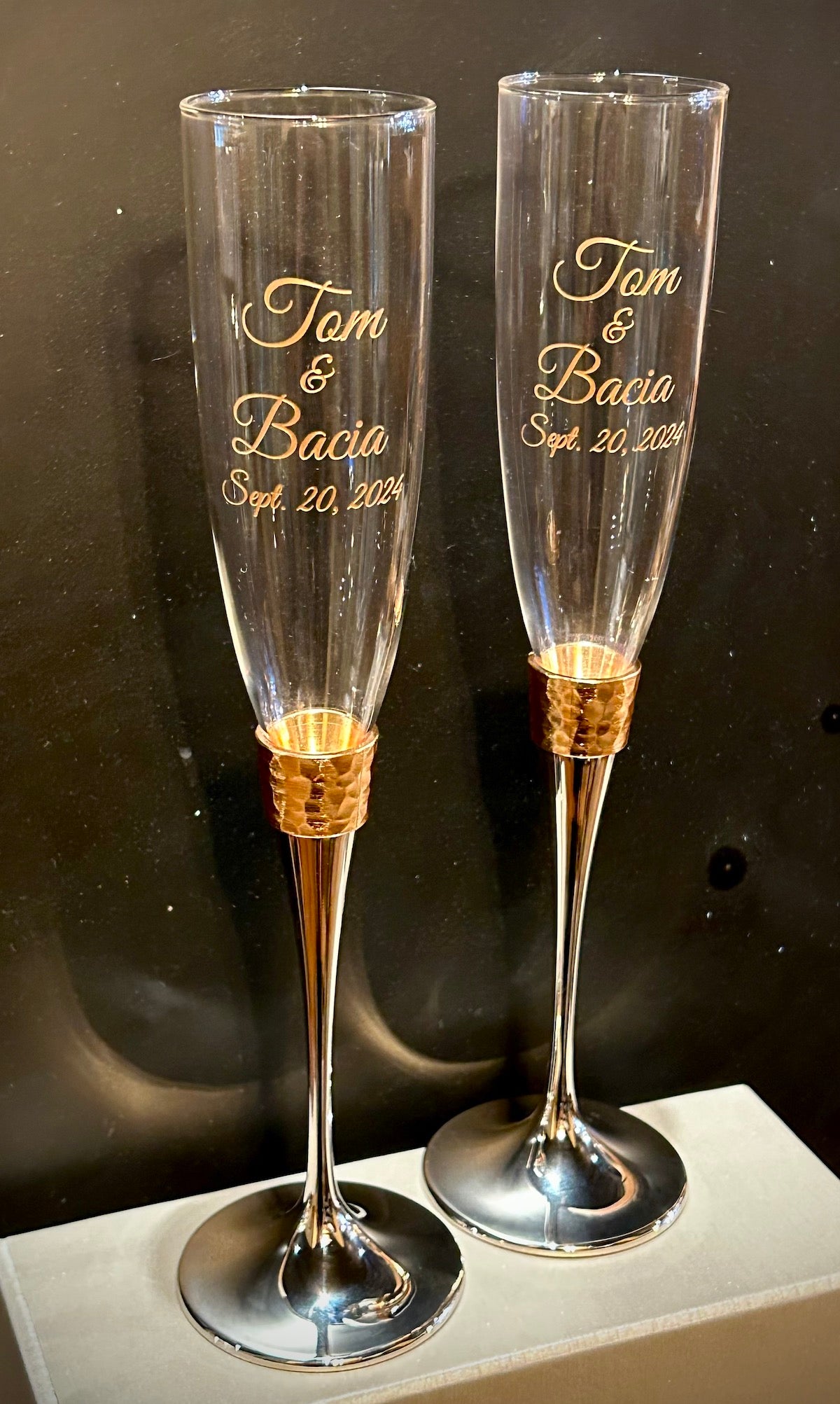 This pair of hammered gold banded flutes stand 10.5" tall and feature glass bowls that hold up to 5 ounces of your favorite champagne or sparkling wine. A wide gold color hammered metal band separates the glass bowls from the polished nickel plated metal stems. The entire look is contemporary elegance destined to be a future family heirloom. The richness of the gold tones of the hammered band complement the silvery tone of the stems and both highlight the rising bubbles in the clear glass. The pair is packaged in a lovely cloth lined silver box that makes a great presentation.