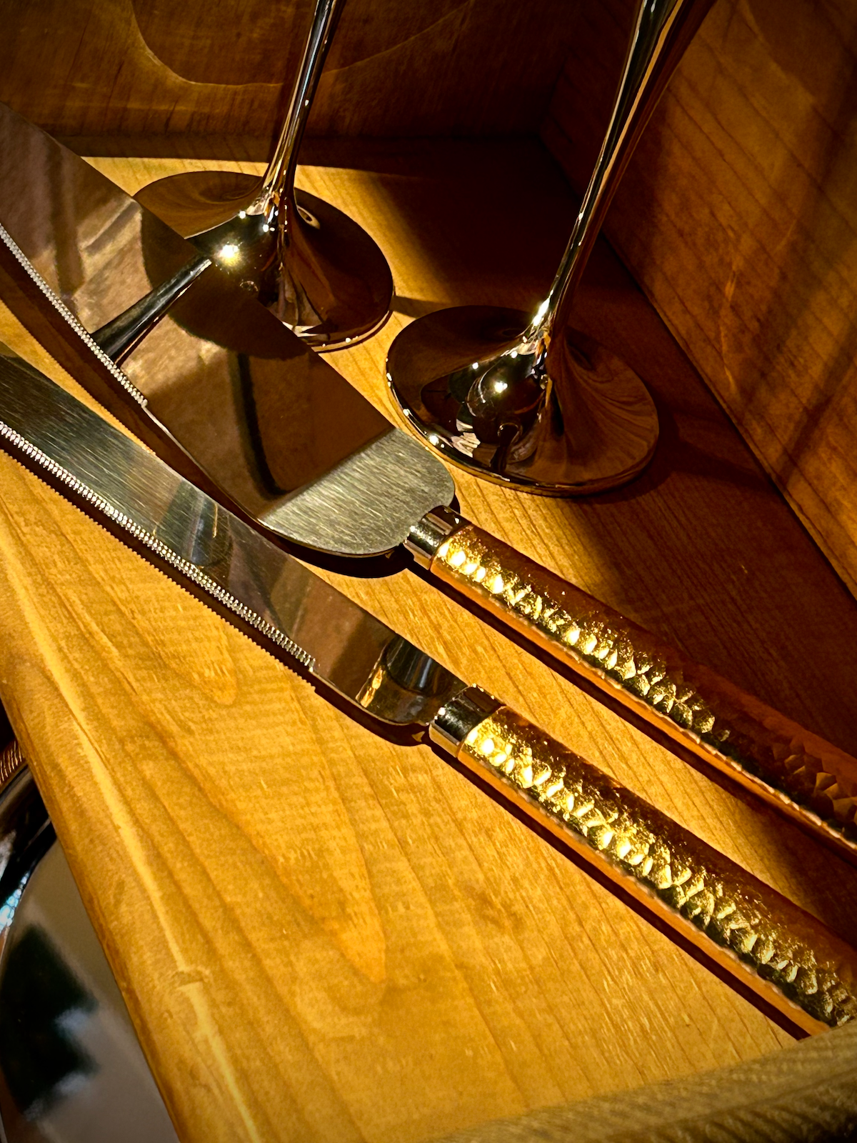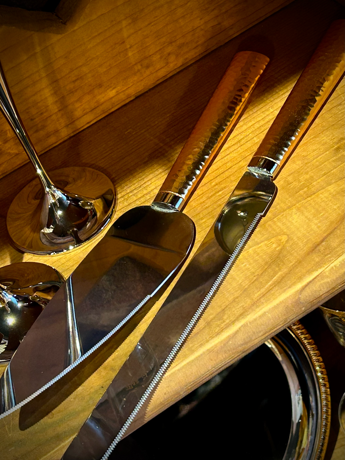 The hammered matte gold combined with the polished silver gives this cake serving set a great sense of style. Whatever the occasion, this gorgeous pair will ensure your cake or pie is served up with a little extra flair. Be sure to add a special message to give this cake serving set a touch of personal polish.