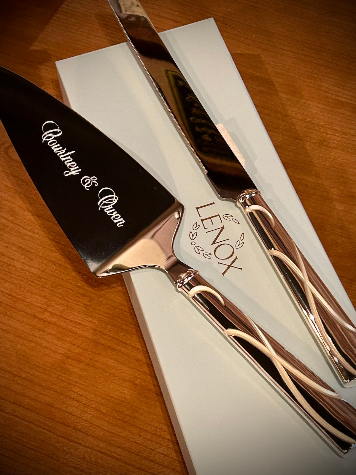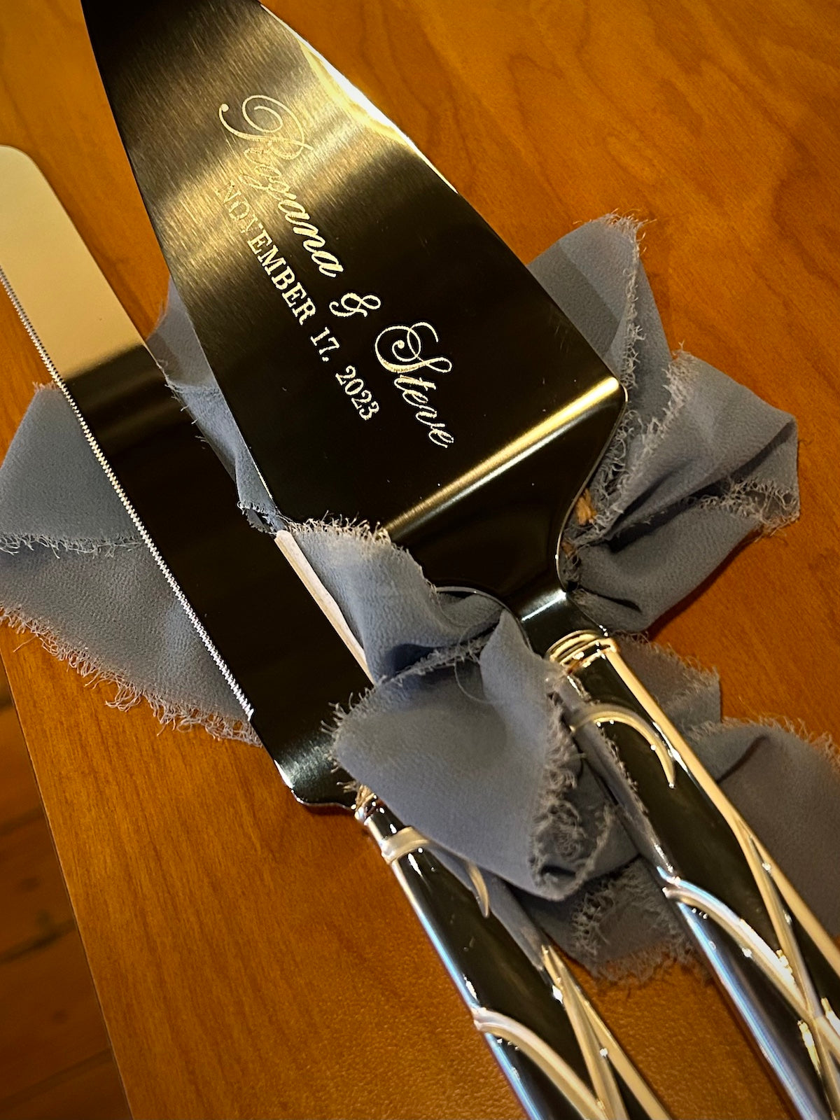 A sleek and elegant ribbon motif accents the handles of the silver-plated Adorn Cake Knife & Server. This set makes a grand entrance when serving cake at a wedding or pie at Thanksgiving dinner.