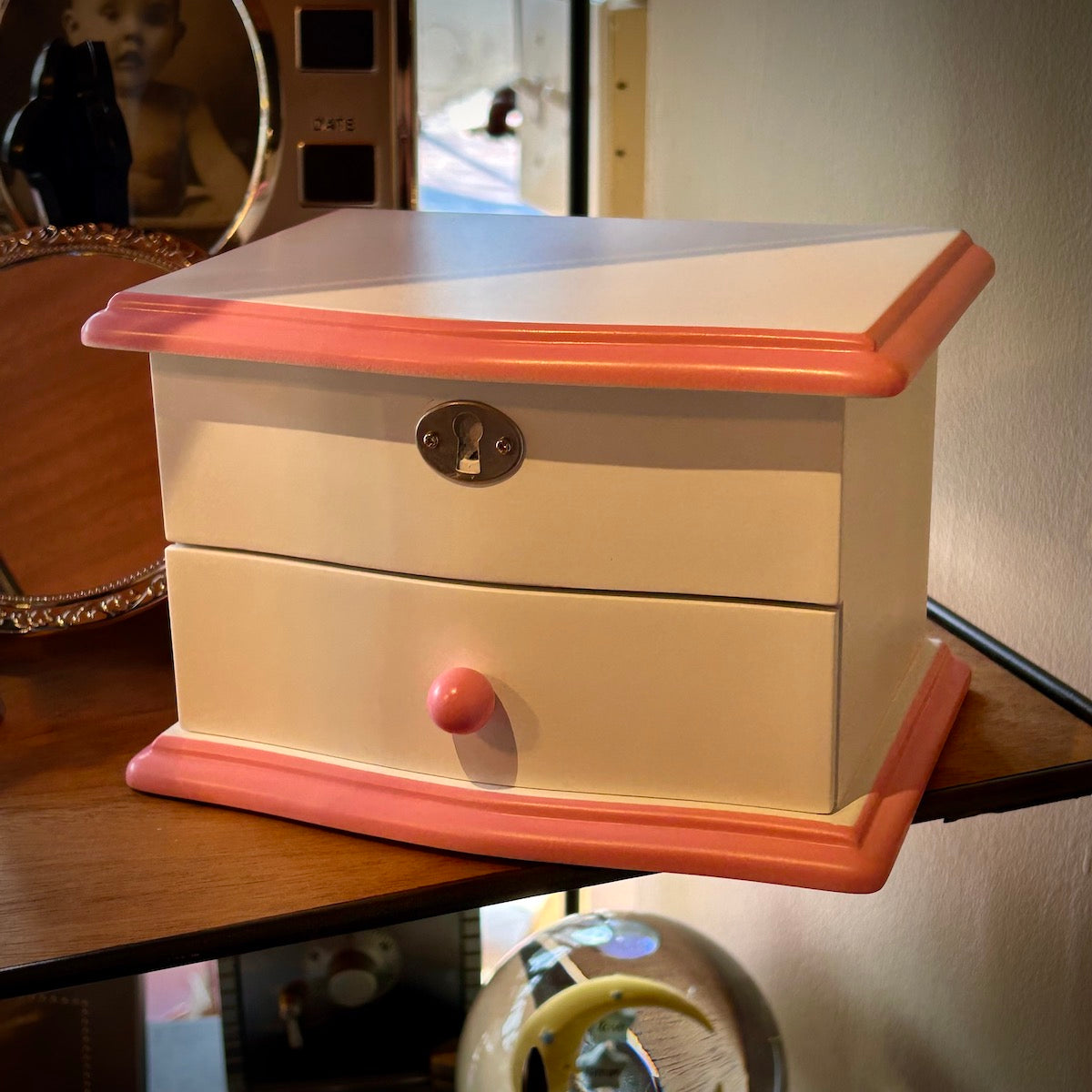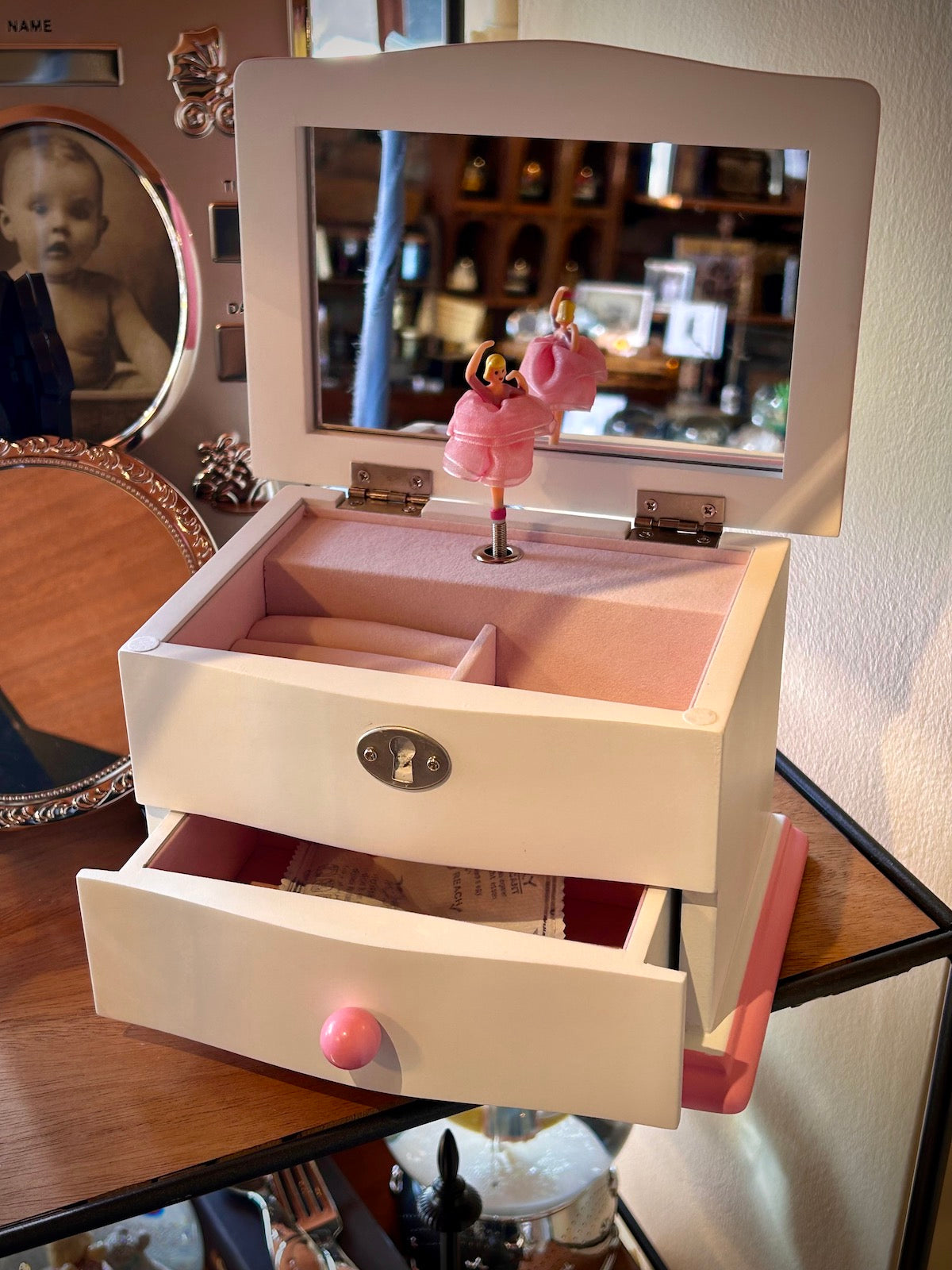This charming Mele and Co wood, musical ballerina jewelry box is a modern take on a childhood classic. Open mirrored lift lid allows your little one to accessorize and coordinate as they get ready for their day. Once open, a whimsical ballerina figurine twirls gracefully to the tune of “Magic Flute”. Single drawer provides extra storage for all their precious pieces. White exterior with pink trim finish and pink suede interior.
