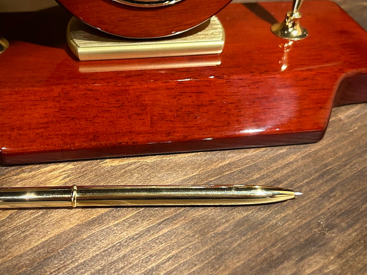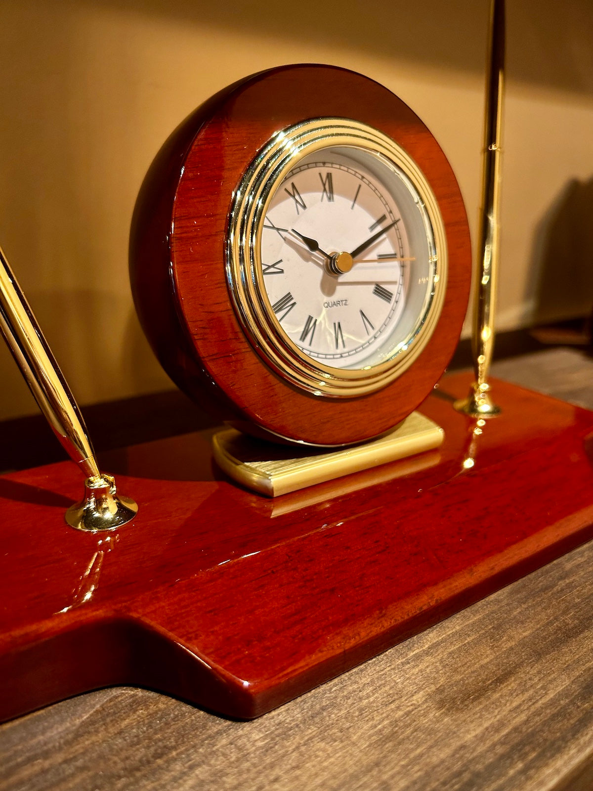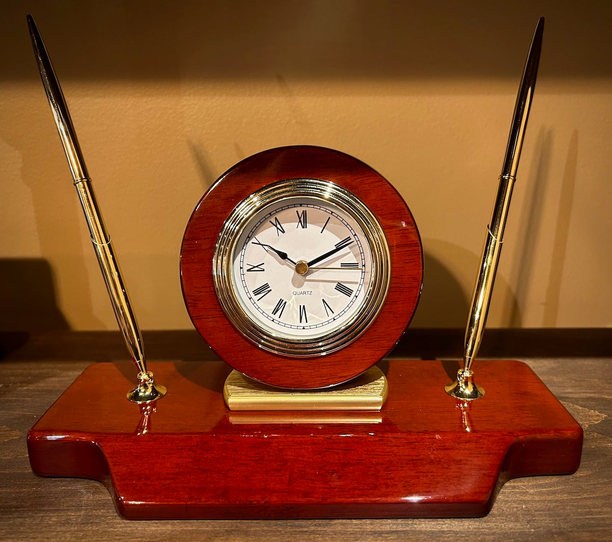 Make their office look official with this classic desk clock and double pen stand. Boasting a gorgeous rosewood glossy piano finish, complimented by gold accented trim and pens, this piece exudes executive gravitas.