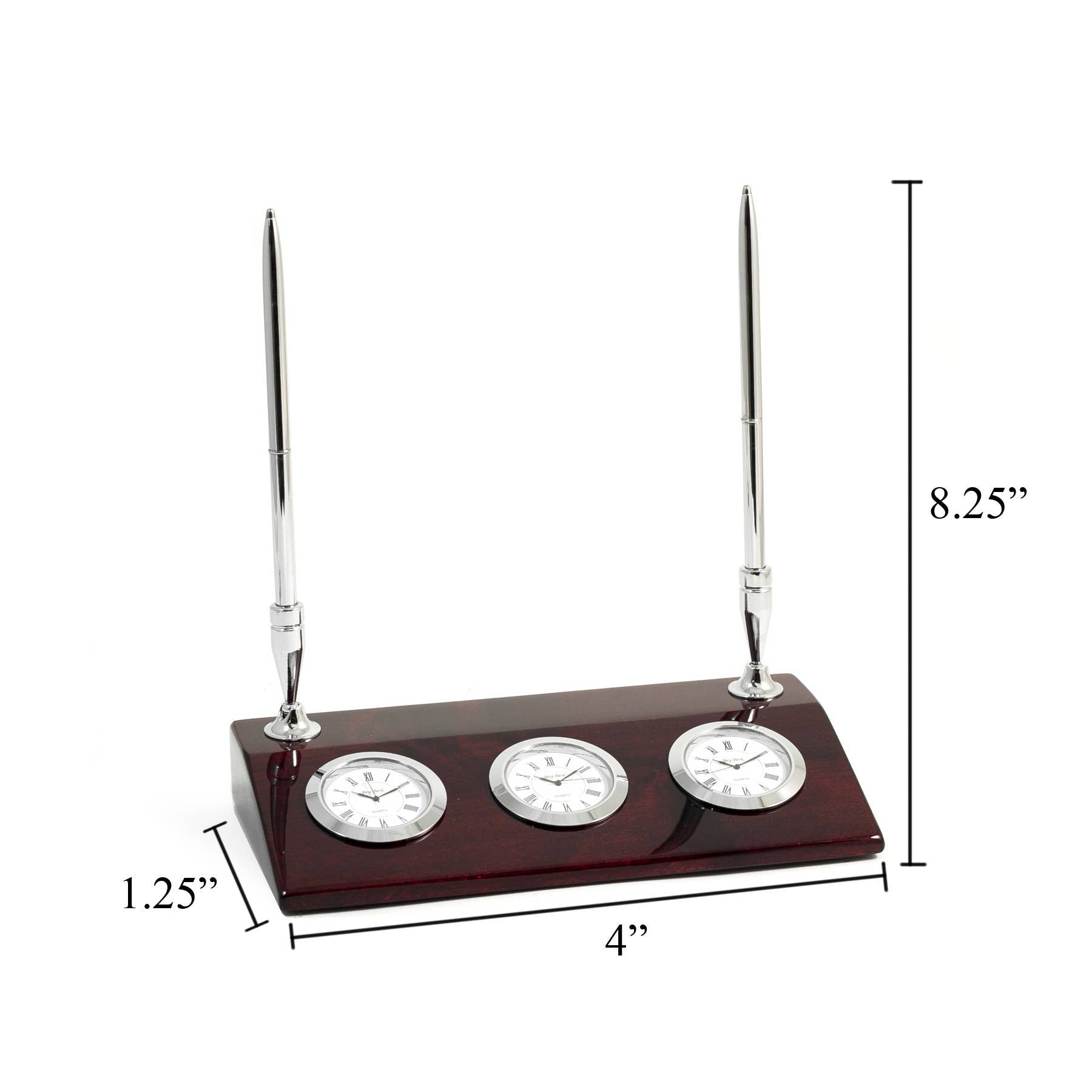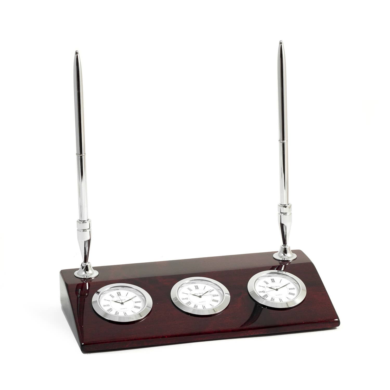 Lacquered "Rosewood" 3 Time Zone Desk Clock with Chrome Accents and 2 Ballpoint Pens.
