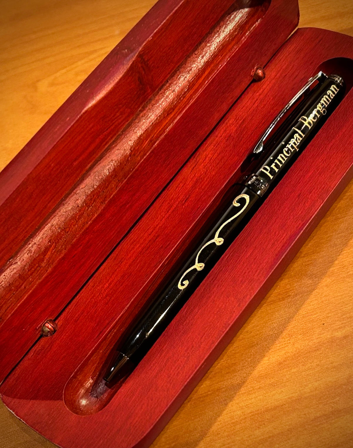 This attractive rosewood finish pen case safely stores and displays one writing instrument. It makes for a distinguished addition to any desk or a reliable safeguard during travels. The ample surface allows for expressing a message that may not fit on a pen engraving as well.