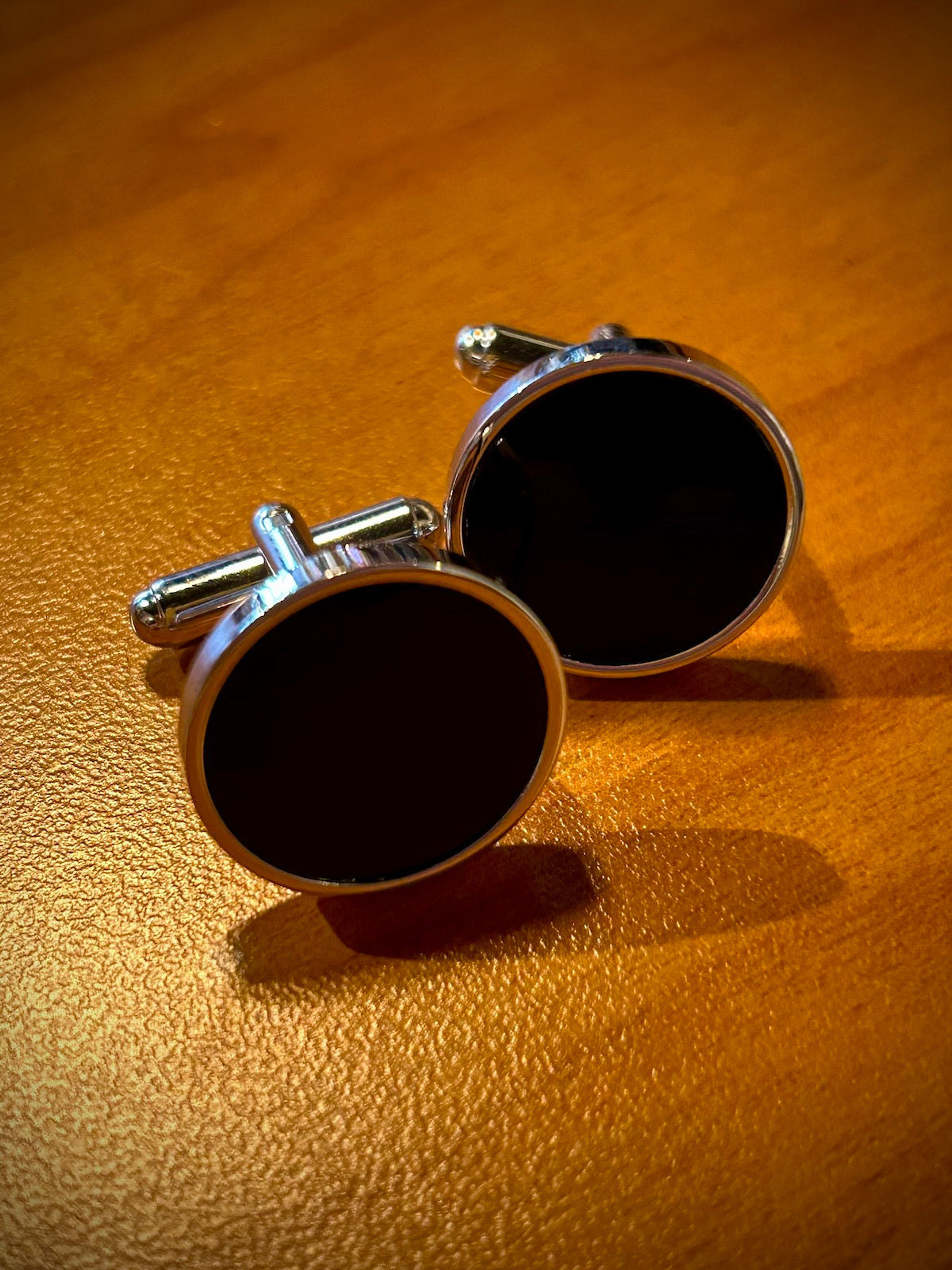 A simply stated classic design, these silver tone cufflinks feature a black center perfect for showcasing an initial or monogram engraving.