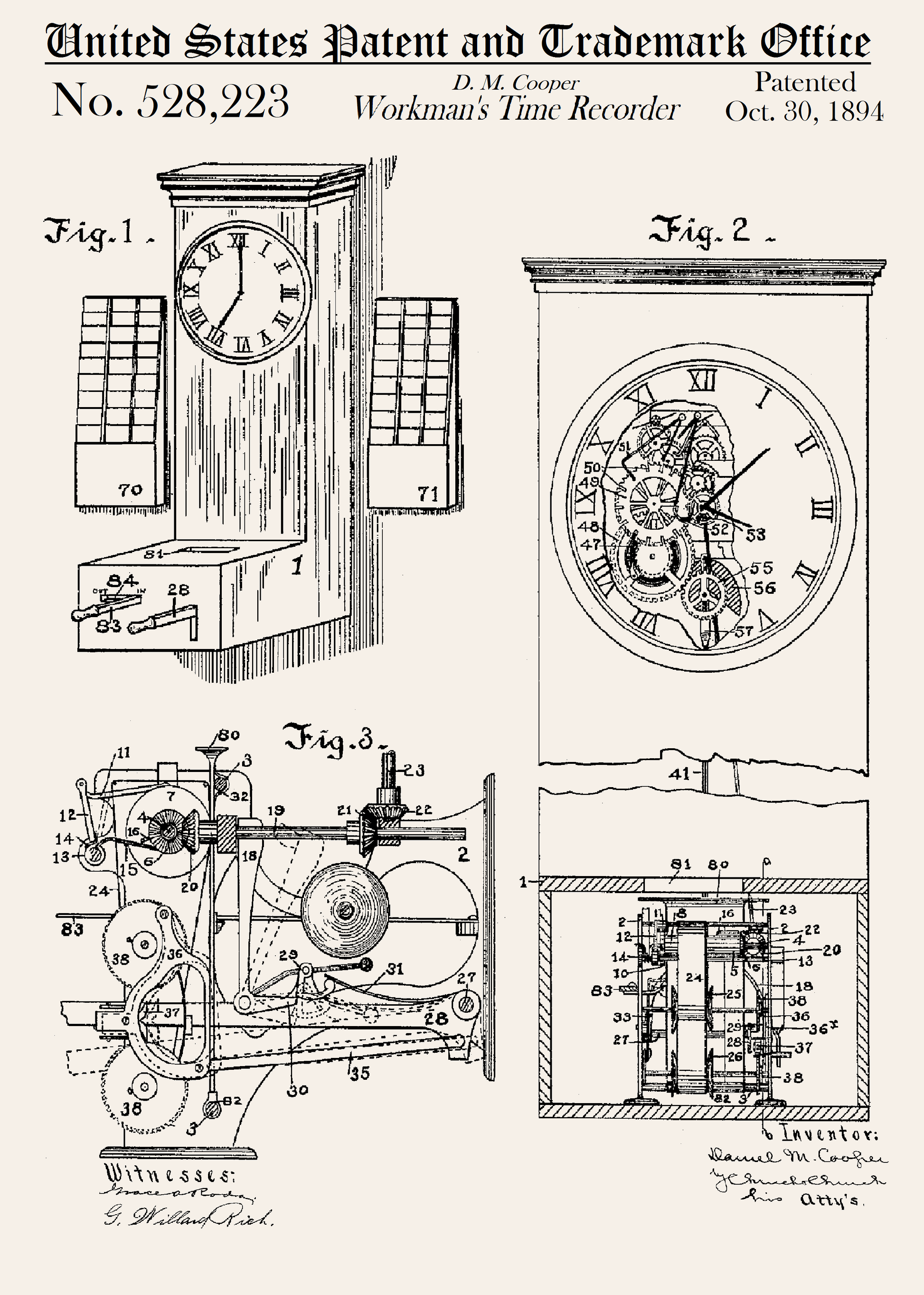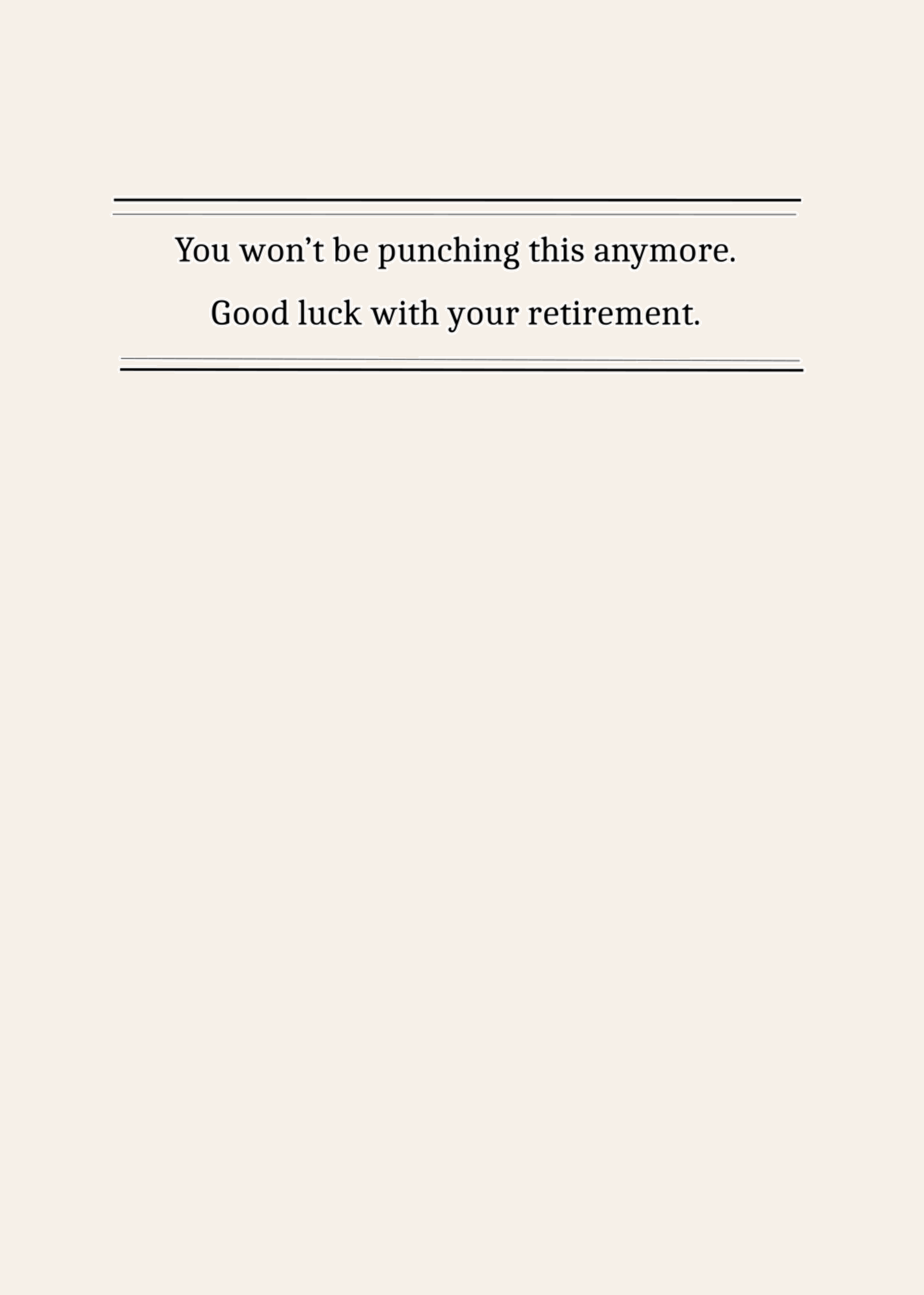A greeting card with the image of the patent for a time clock on the front and a funny retirement message on the inside.